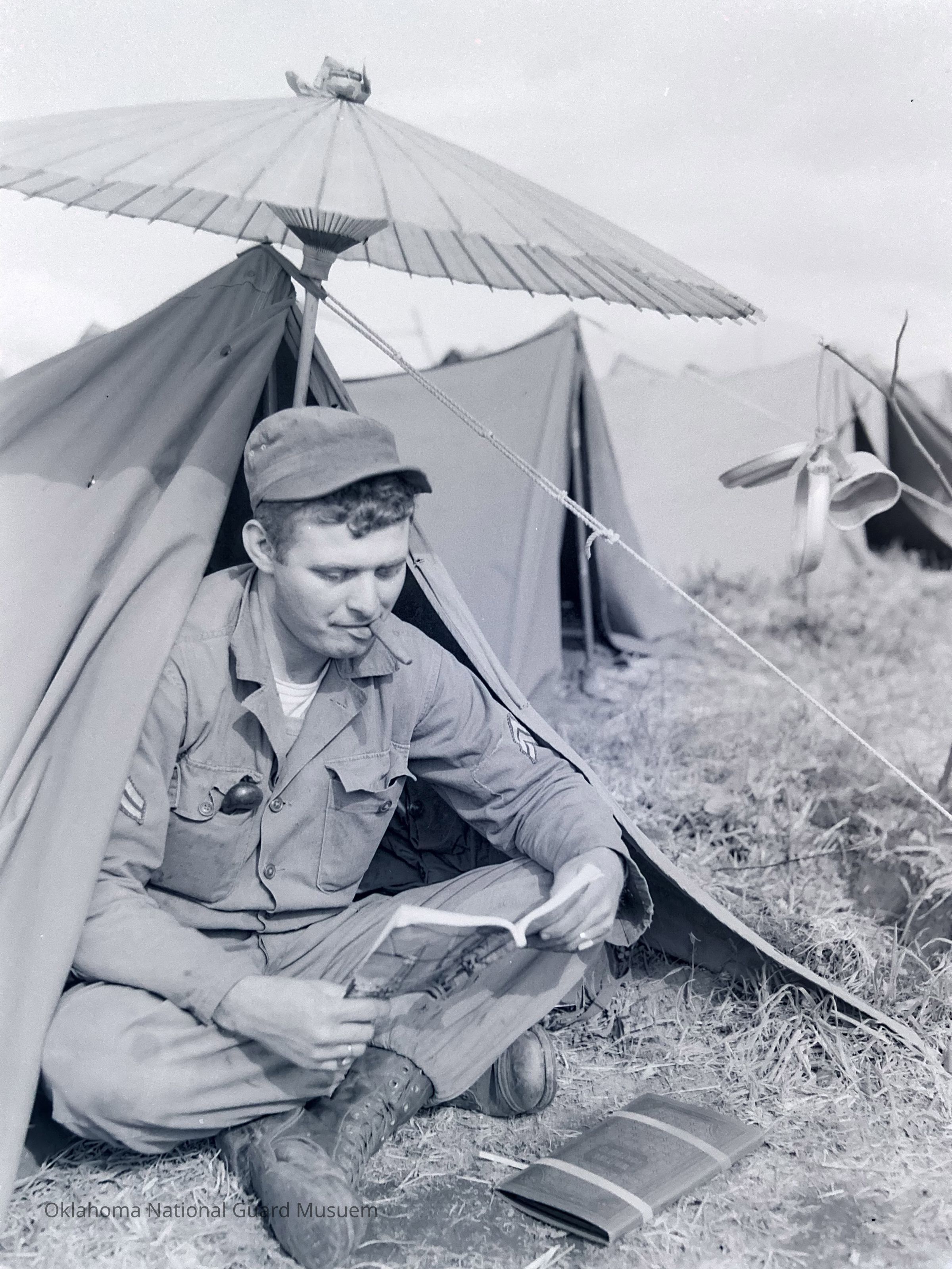 Soldier reading in his pup tent