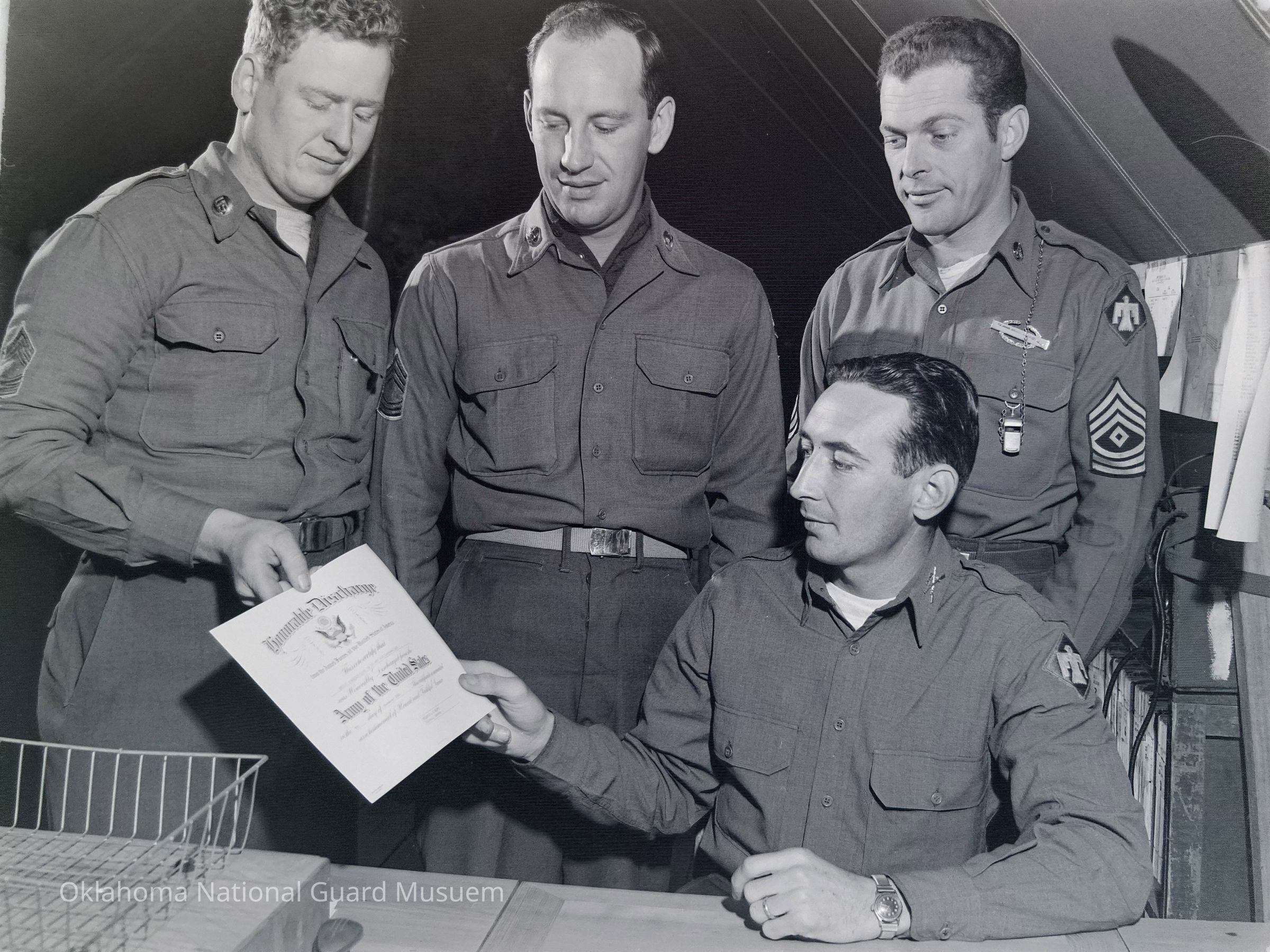Negative of a soldier receiving an honorable discharge certificate on Hokkaido, Japan