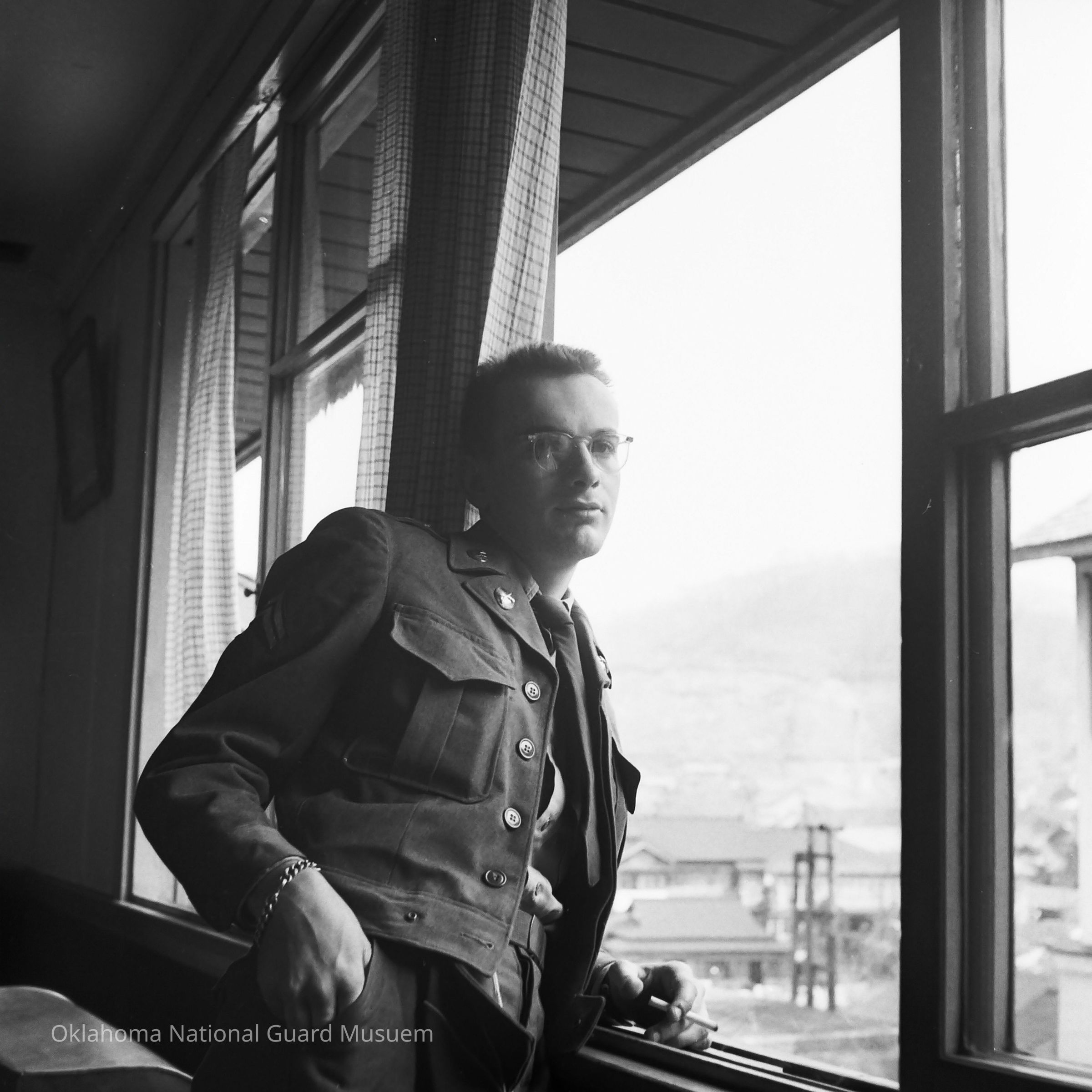 Negative of a soldier relaxing at window at Noboroibetsu Hotel