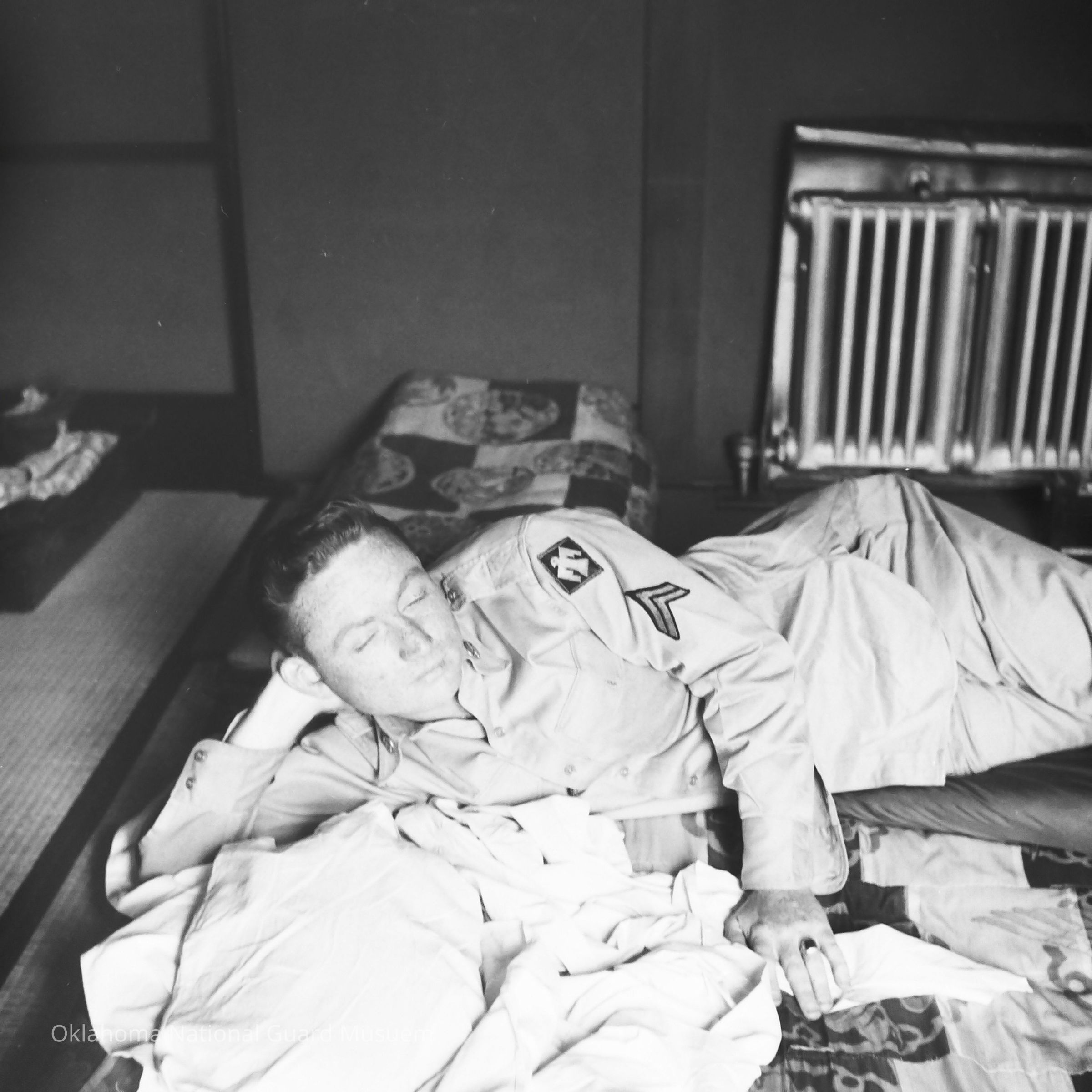 Negative of a soldier relaxing in a bed at Noboroibetsu Hotel