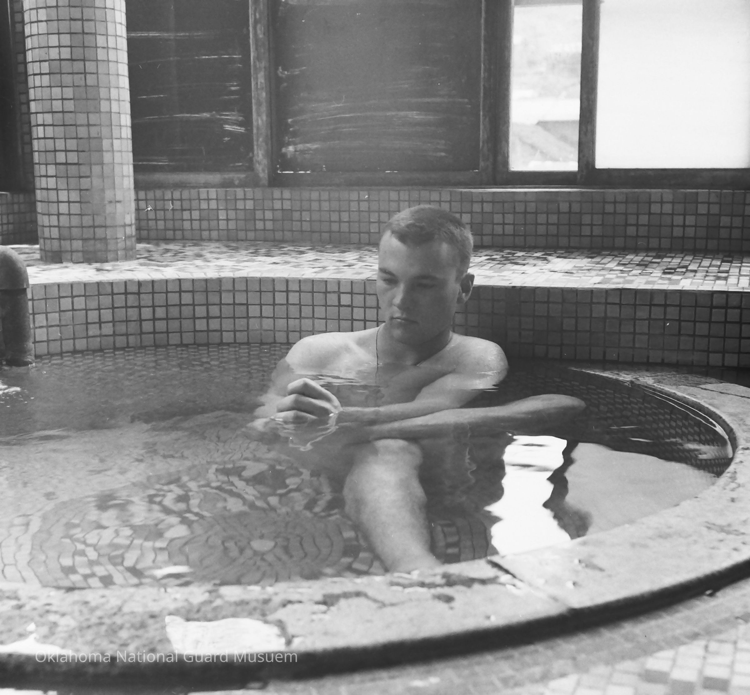 Negative of a soldier relaxing in a pool