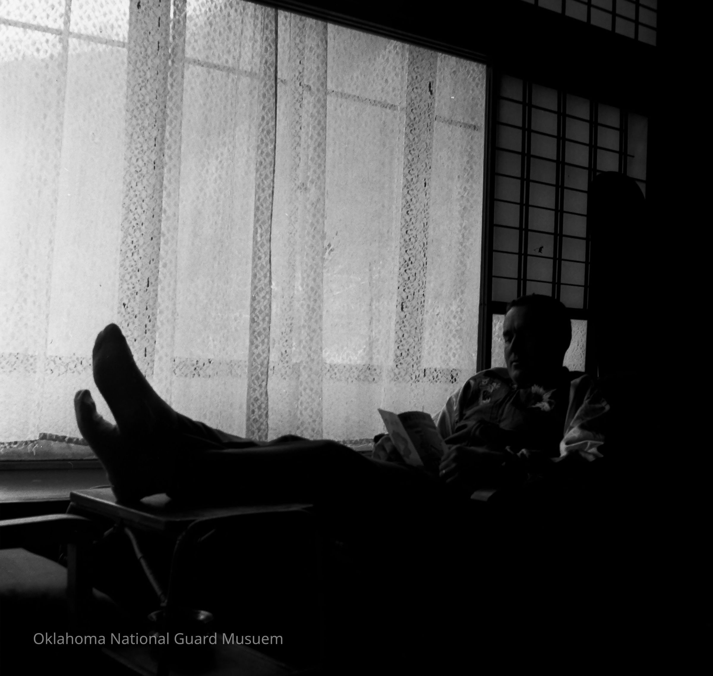 Negative of a soldier relaxing in a hotel room