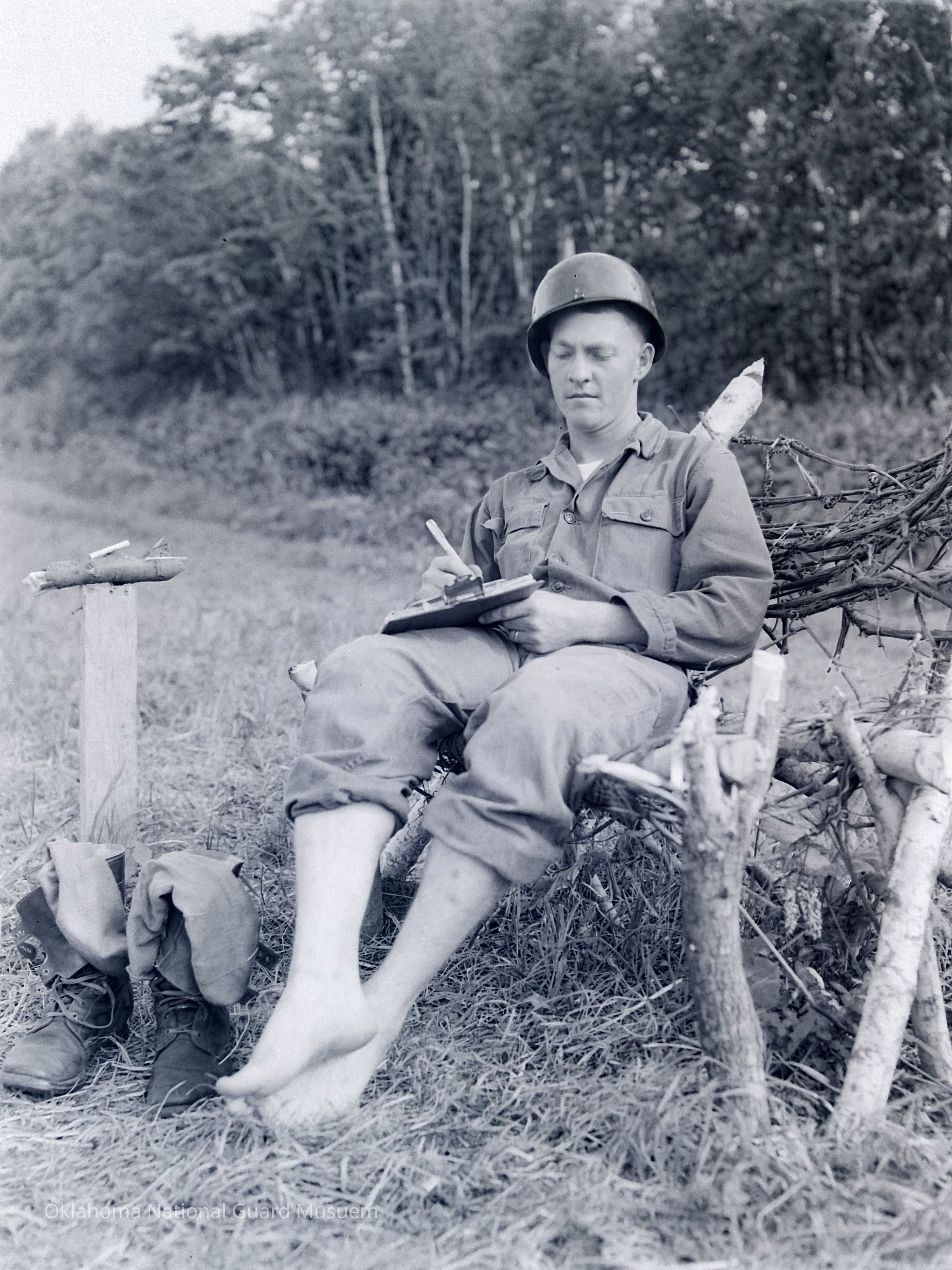 Soldier relaxing outside in homemade chair