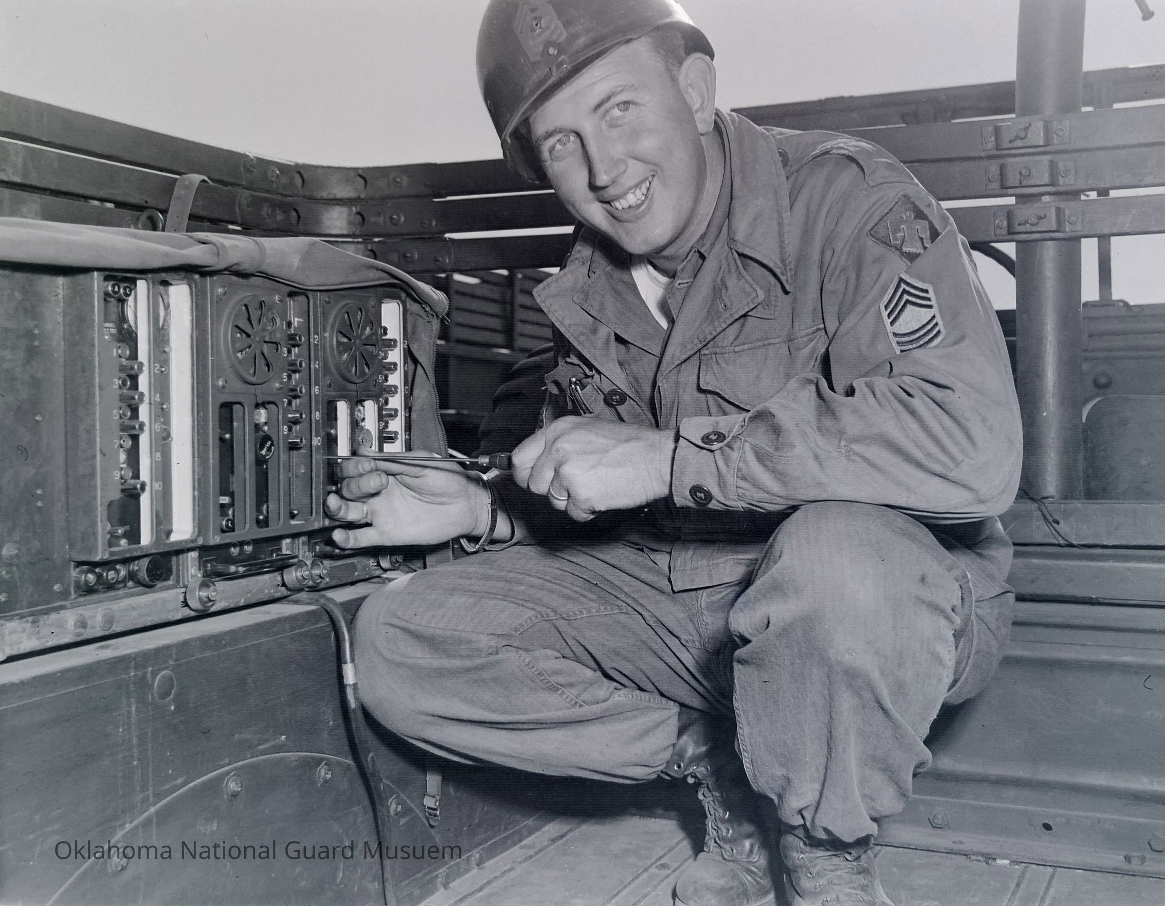 Soldier repairing communication gear