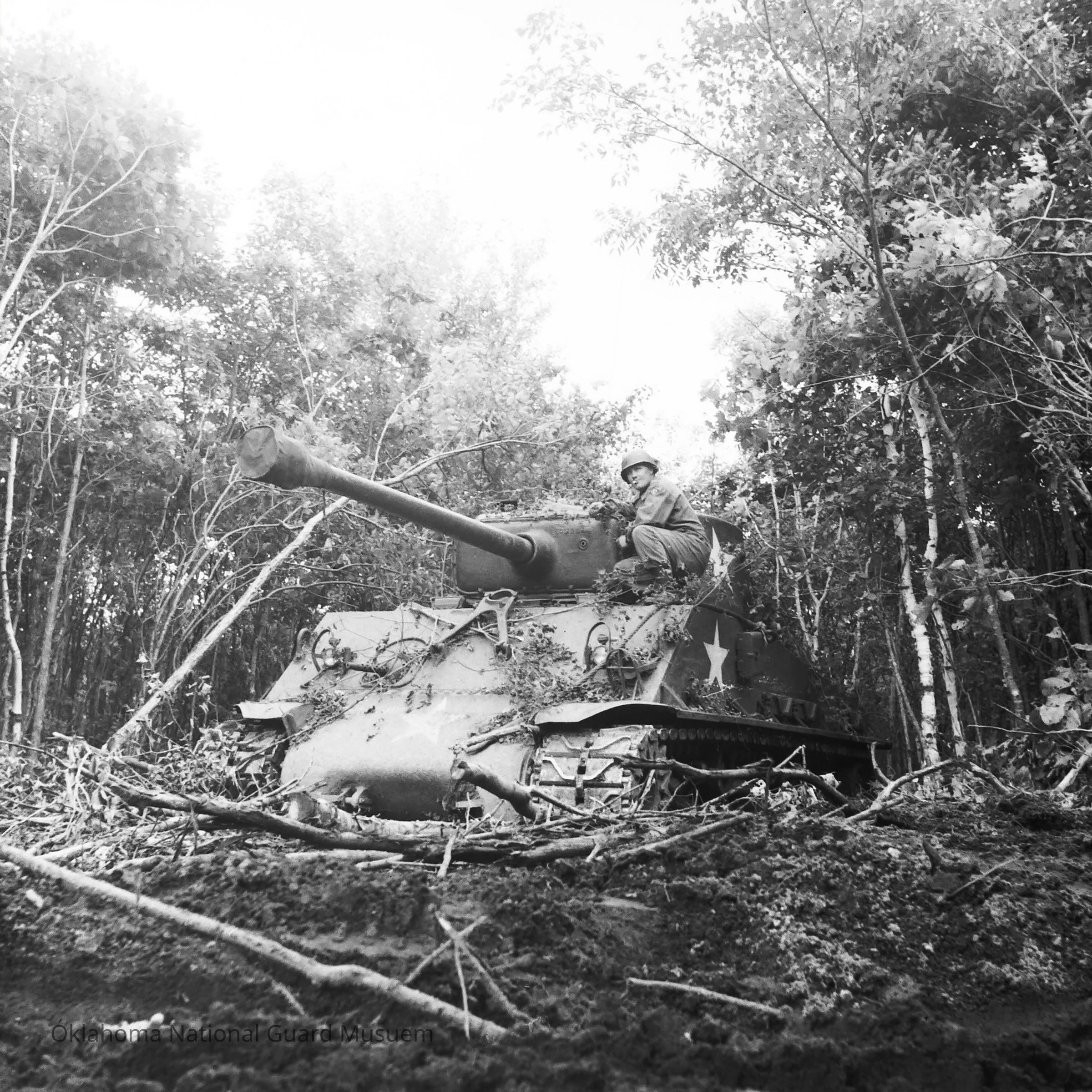 Negative of a soldier riding on a tank as it moves through trees