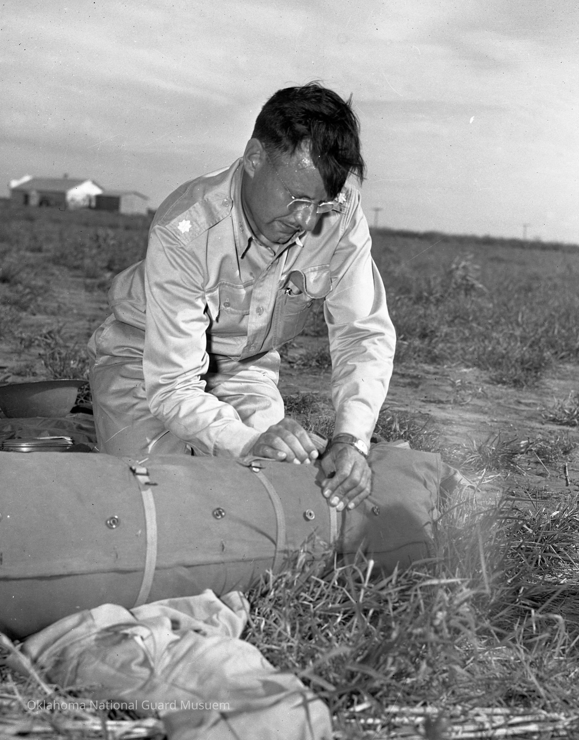 Negative Lt. Francis J. Reichmann rolling military clothing in a shelter half