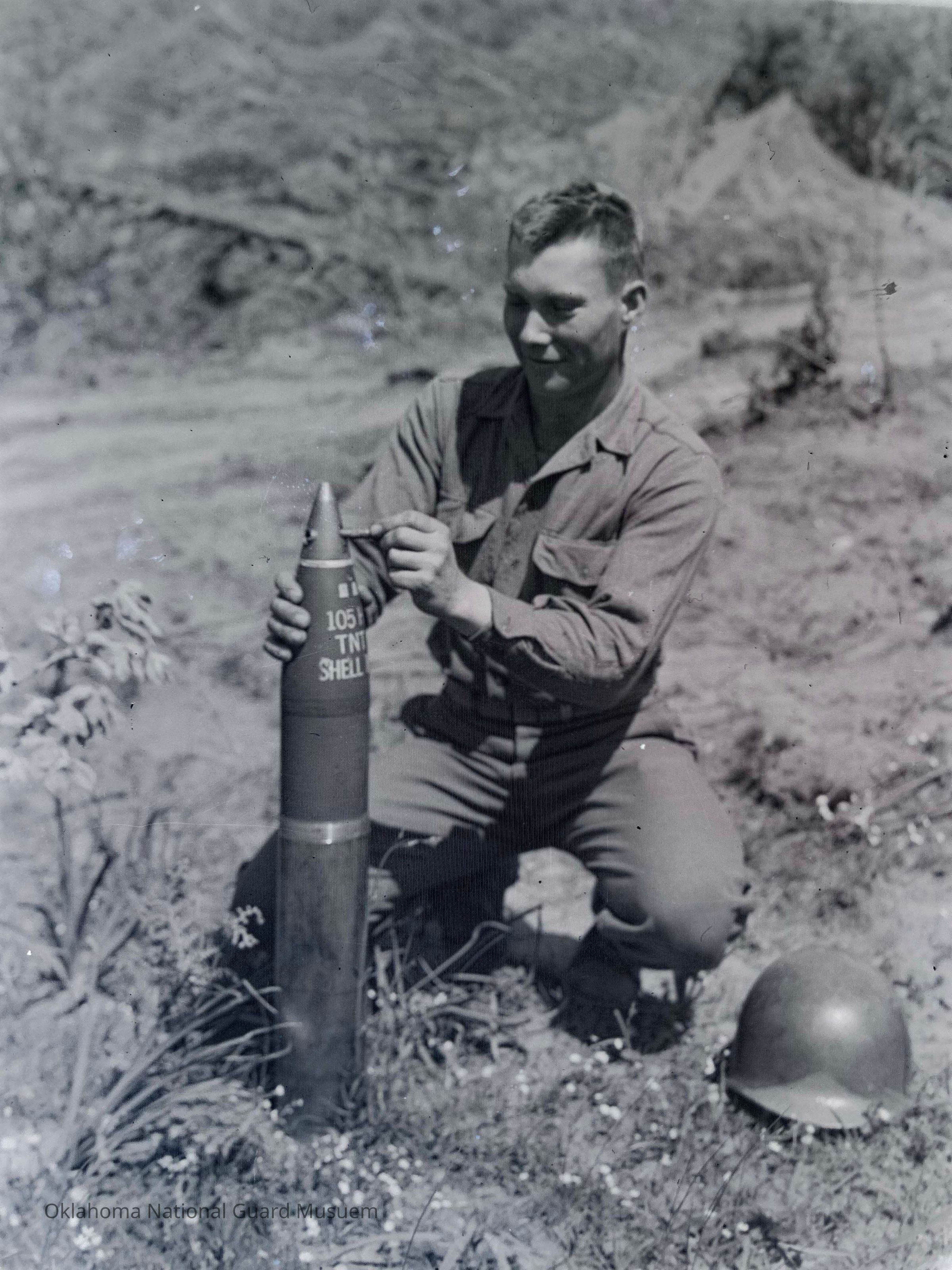 Soldier showing bullet pierced artillery shellEntry/Object ID