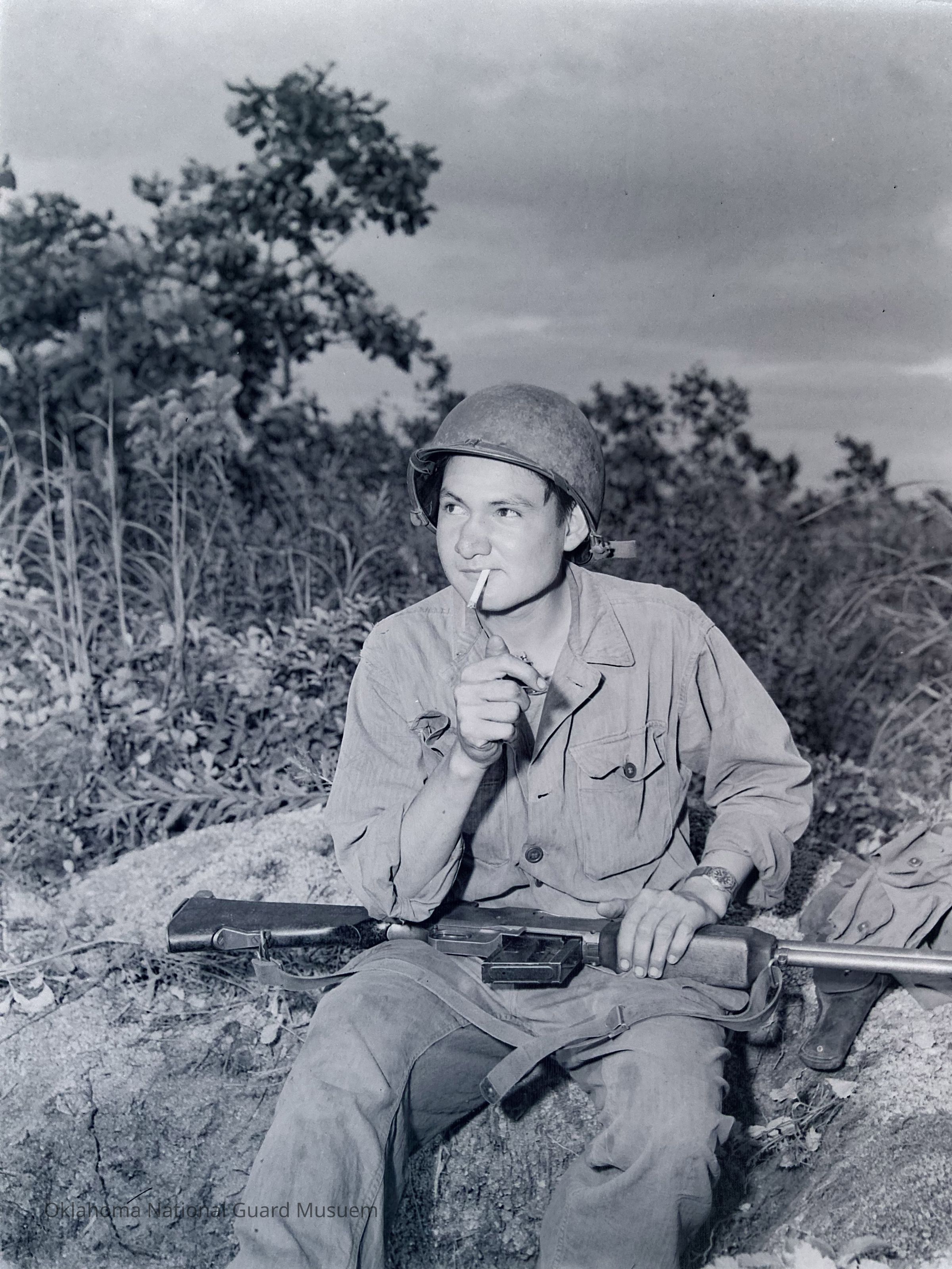 Soldier sitting on a rock smoking a cigarette and holding a BAR