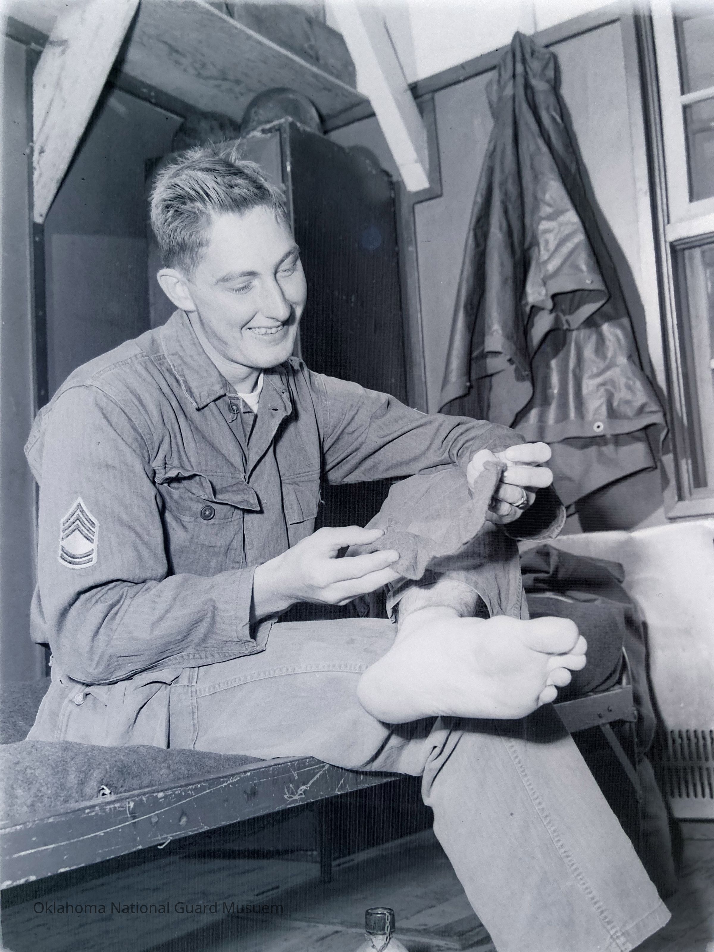 Soldier sitting on his bunk putting on socks