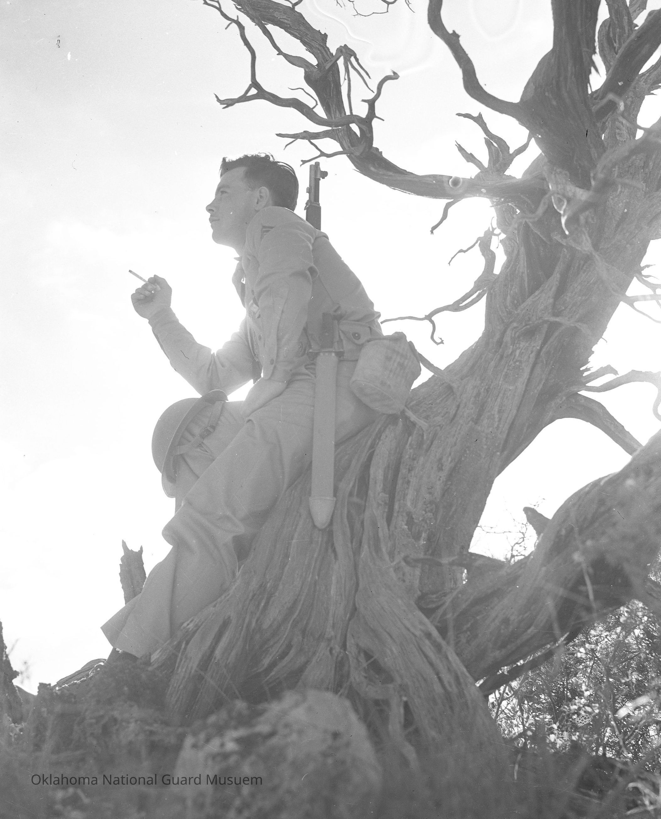 Negative of a soldier smoking a cigarette while resting against a gnarled tree