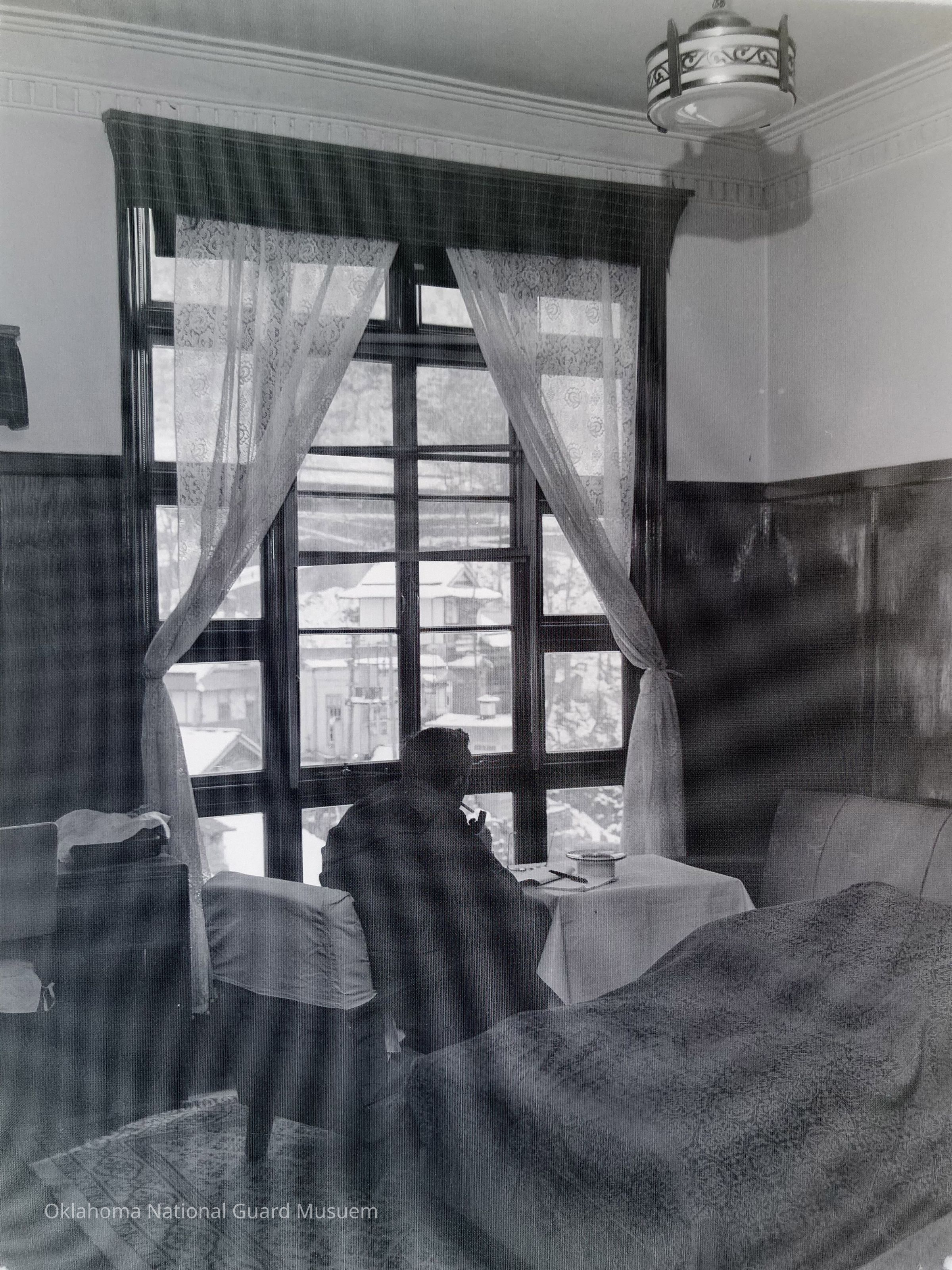 Negative of a soldier smoking in hotel room on Hokkaido, Japan