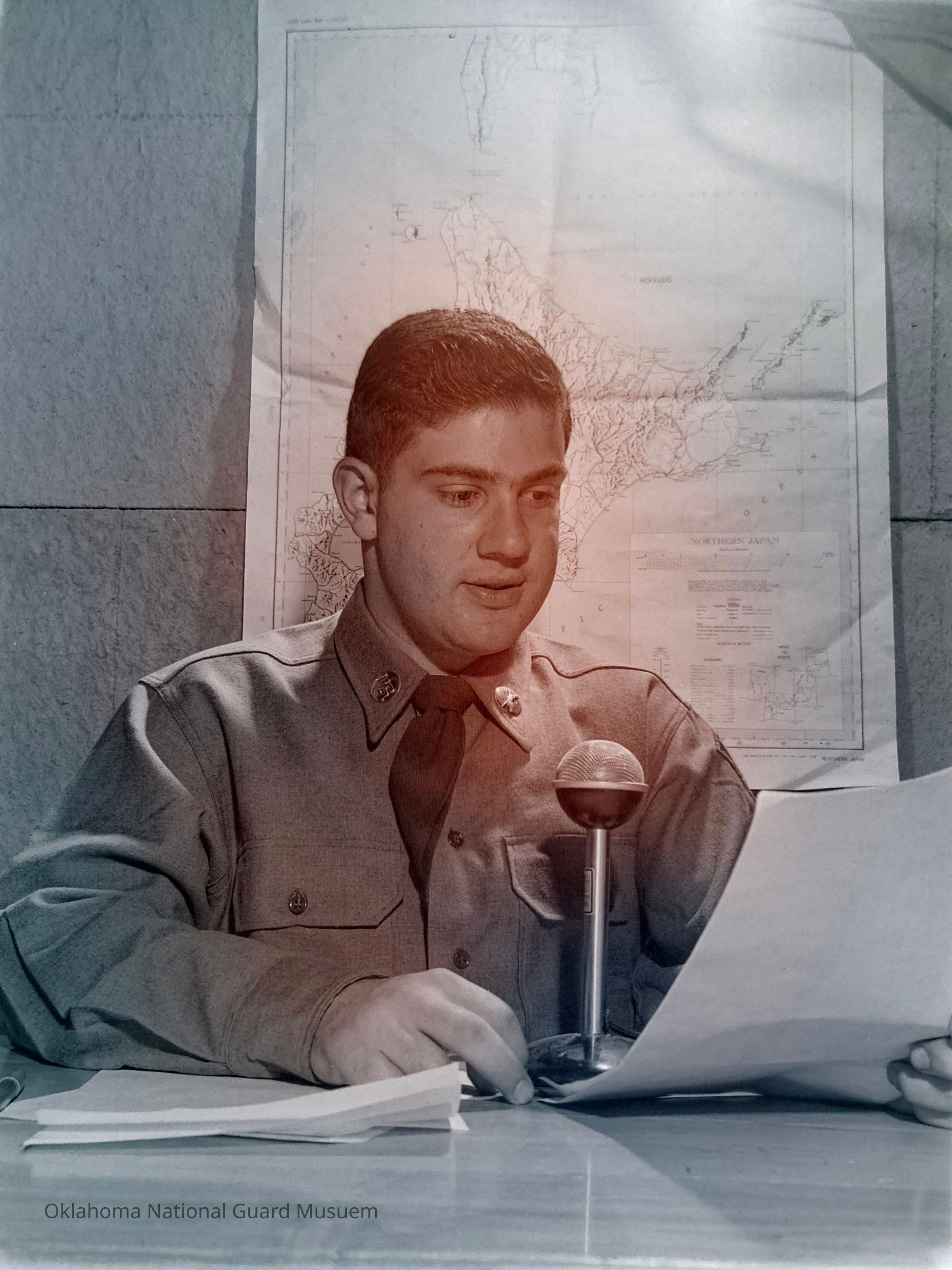 Negative of a soldier speaking into a microphone on Hokkaido, Japan