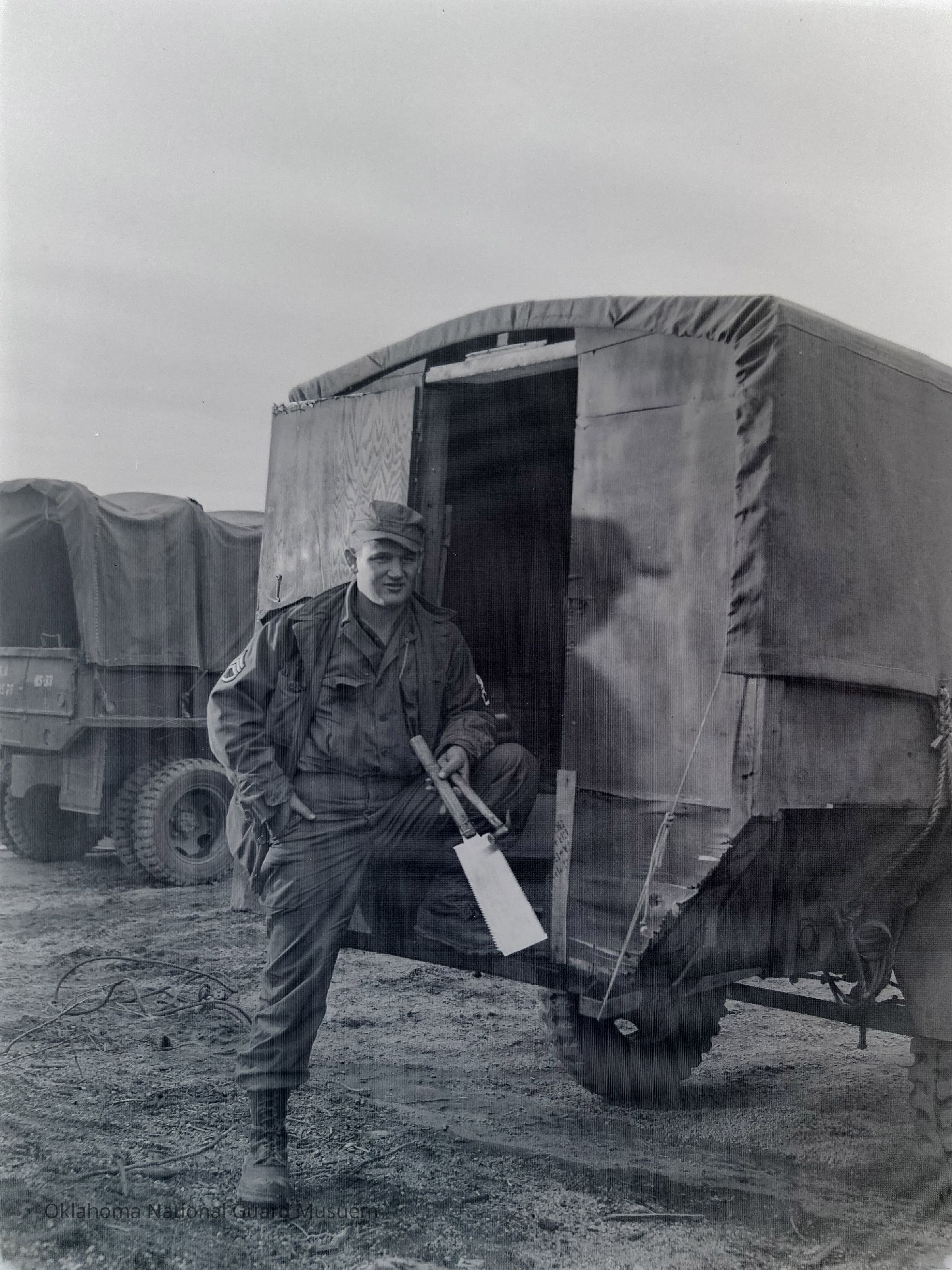 Negative of a soldier standing behind a trailer-mounted hut on Hokkaido, Japan