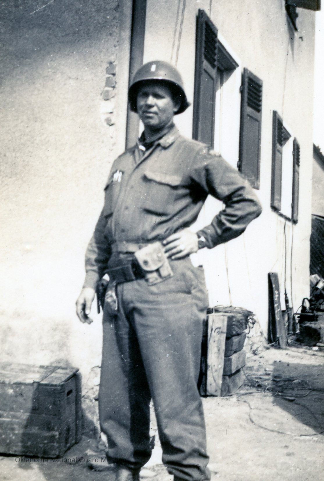 Albert C. Thomas standing in front of a house Headquarters Battery 160th Field Artillery