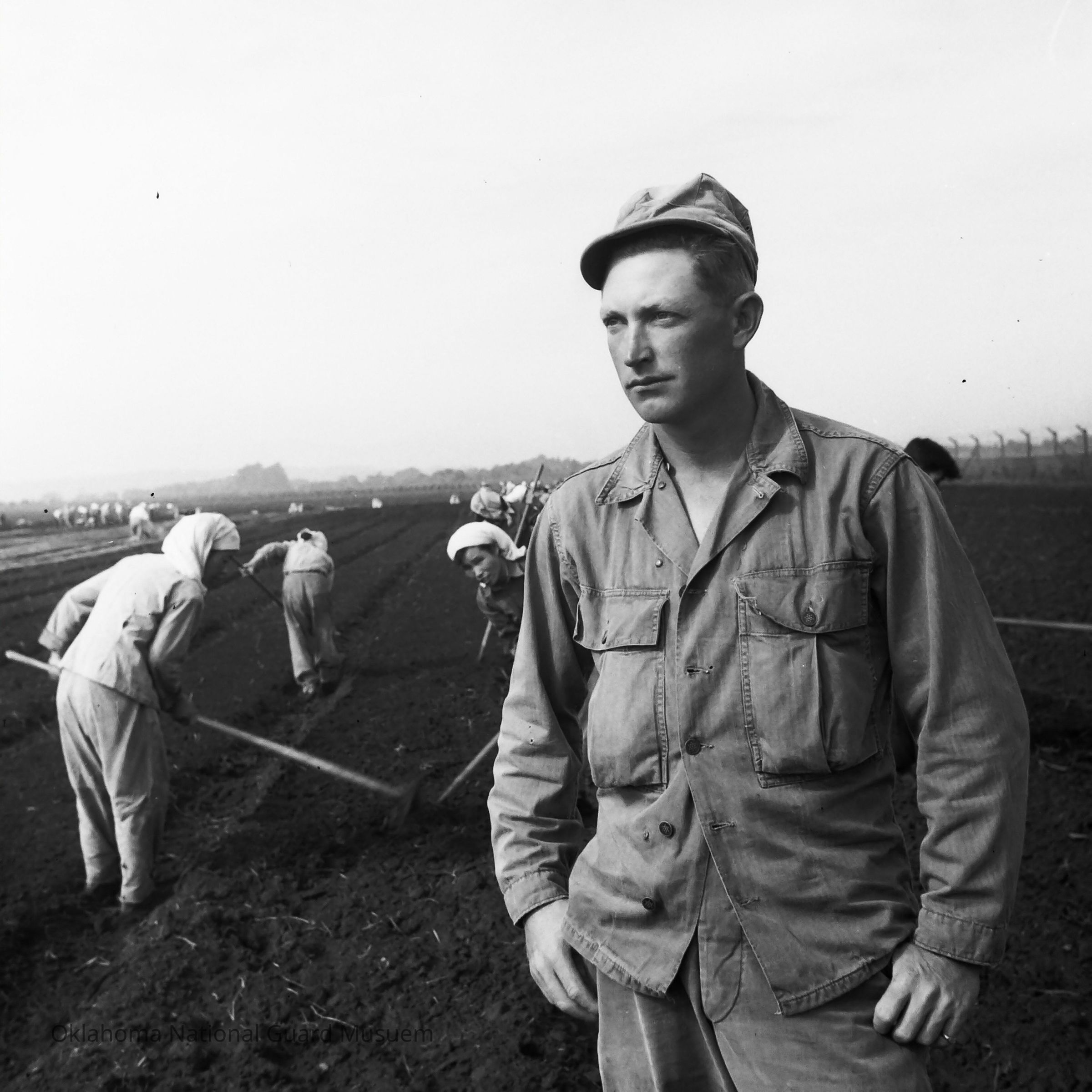 Negative of a soldier standing in front of a group of Japanese women working farm fields