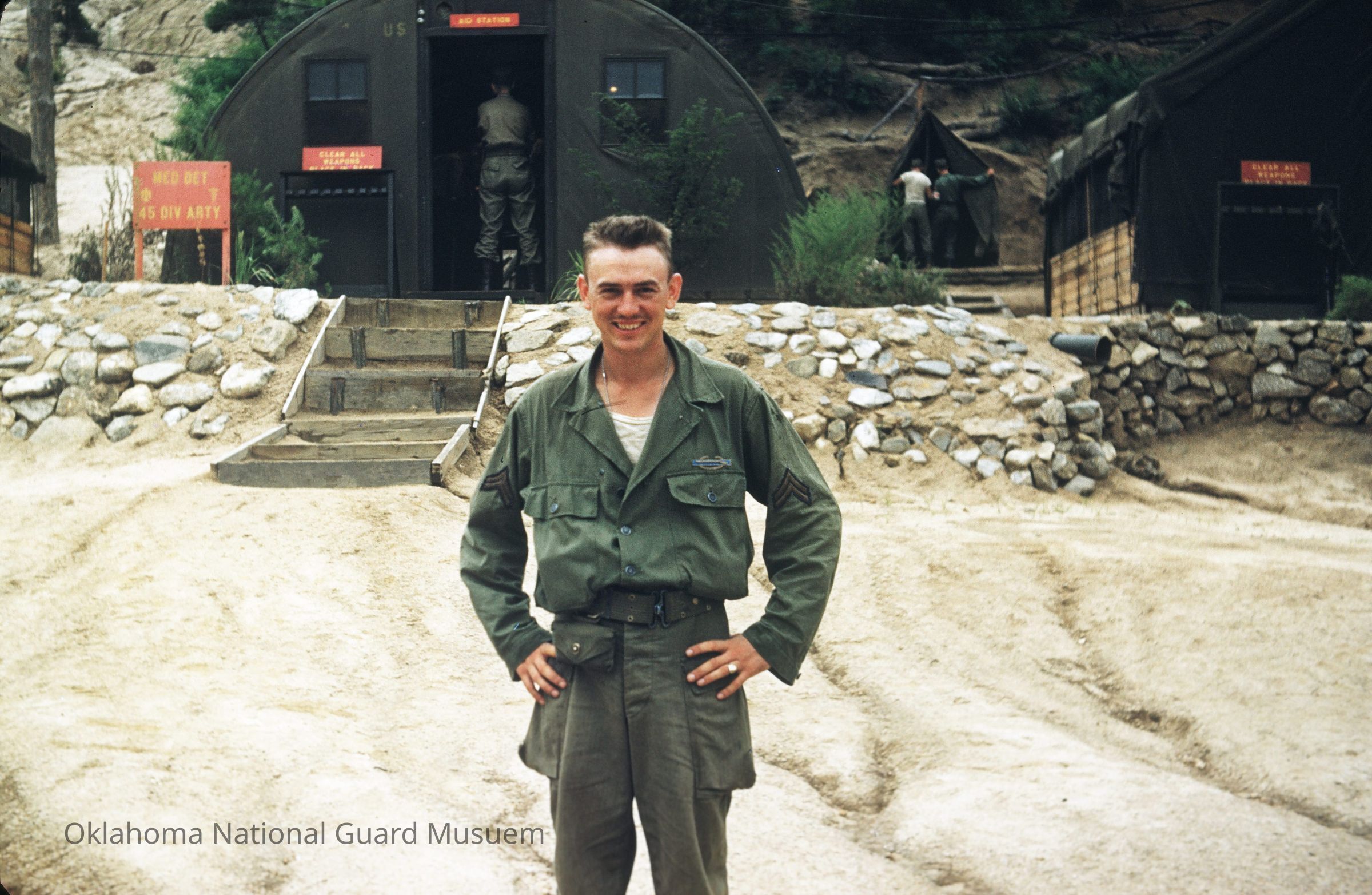 Aloysius (Al) Haverkamp in front of Quonset huts housing the Medical Detachment 45th Division Artillery