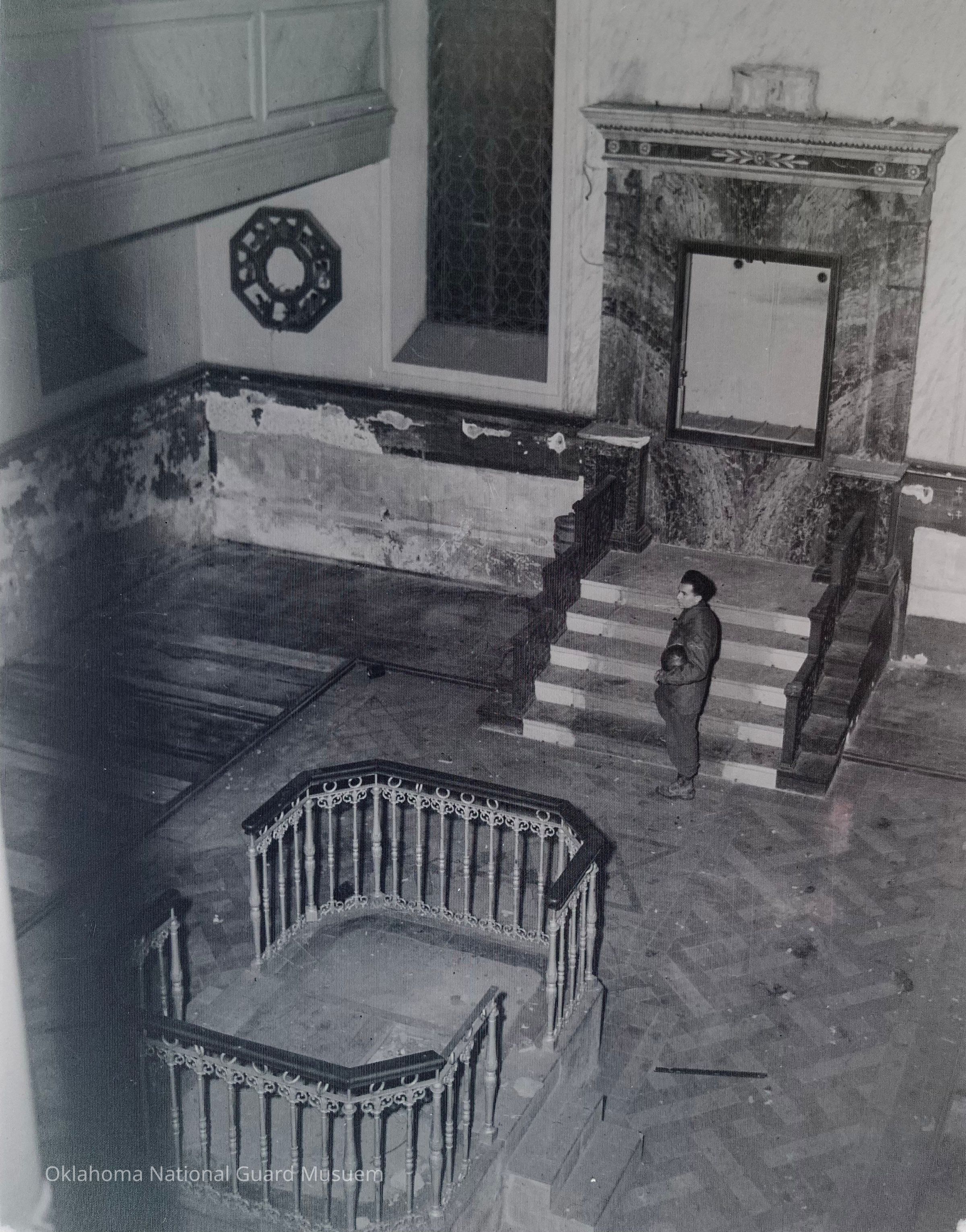 Negative of Louis Chlopat (New York City, New York) standing inside a destroyed synagoguePhotograph Details