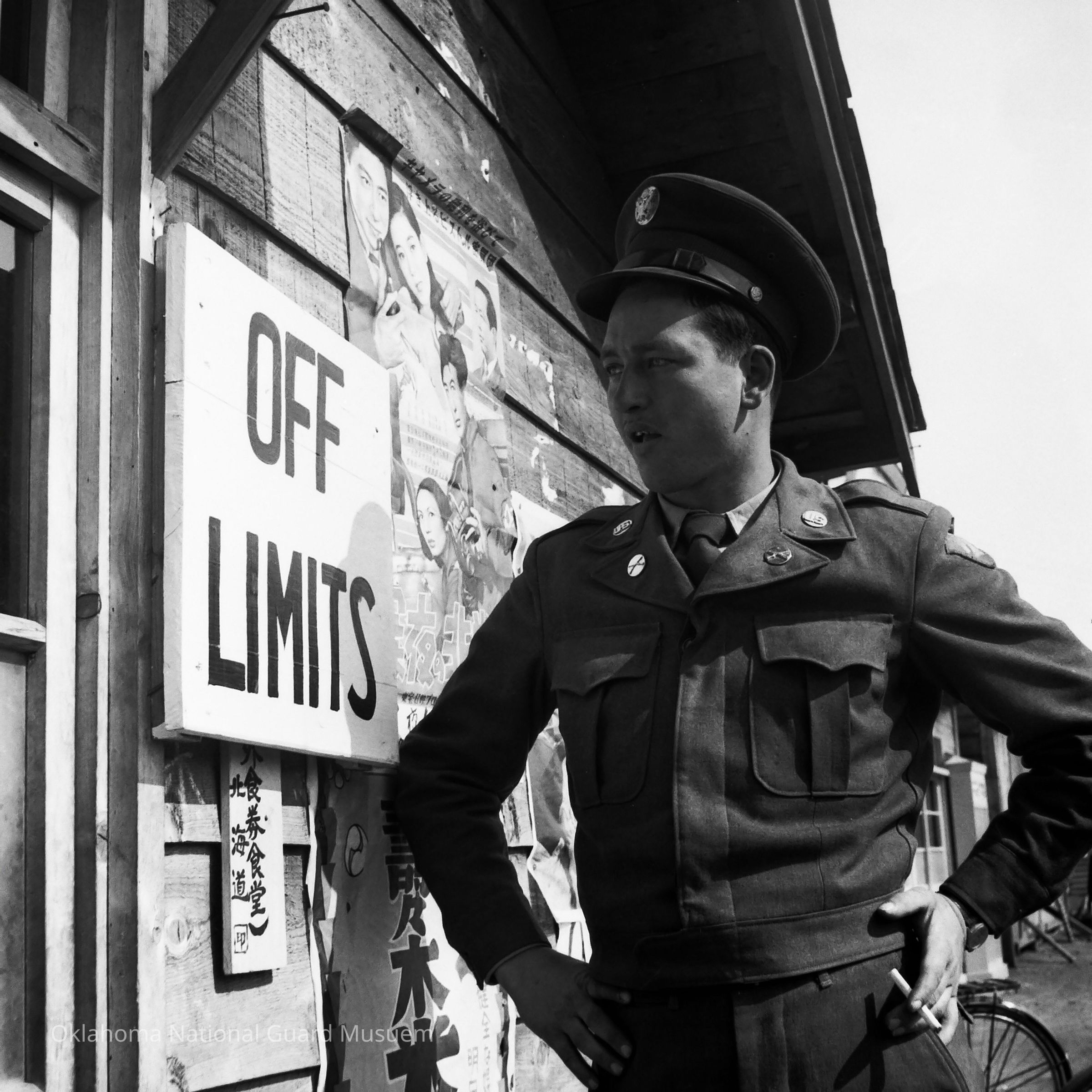 Negative of a soldier staring at a building posted "Off Limits"