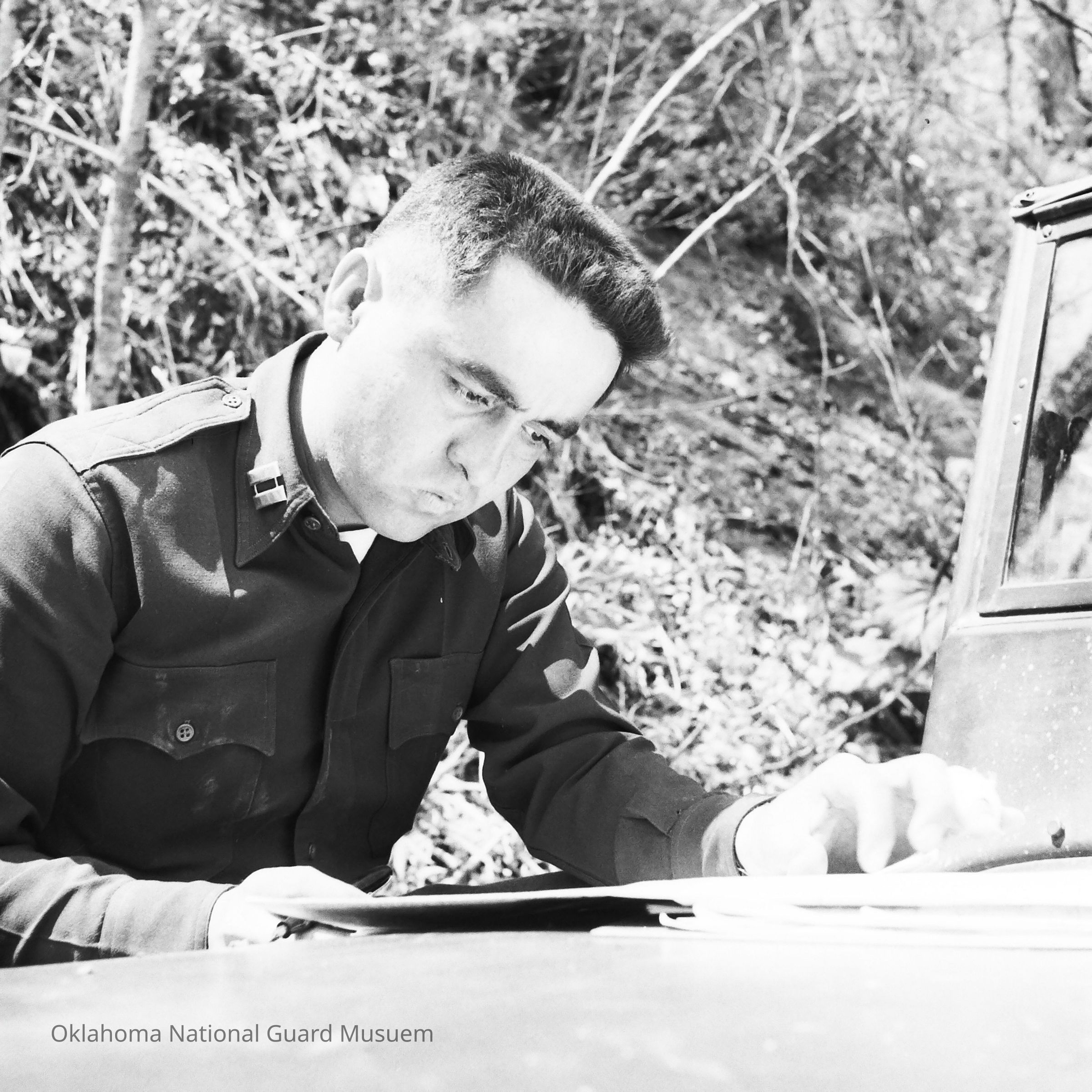 Negative of a soldier studying a map on the hood of a jeep