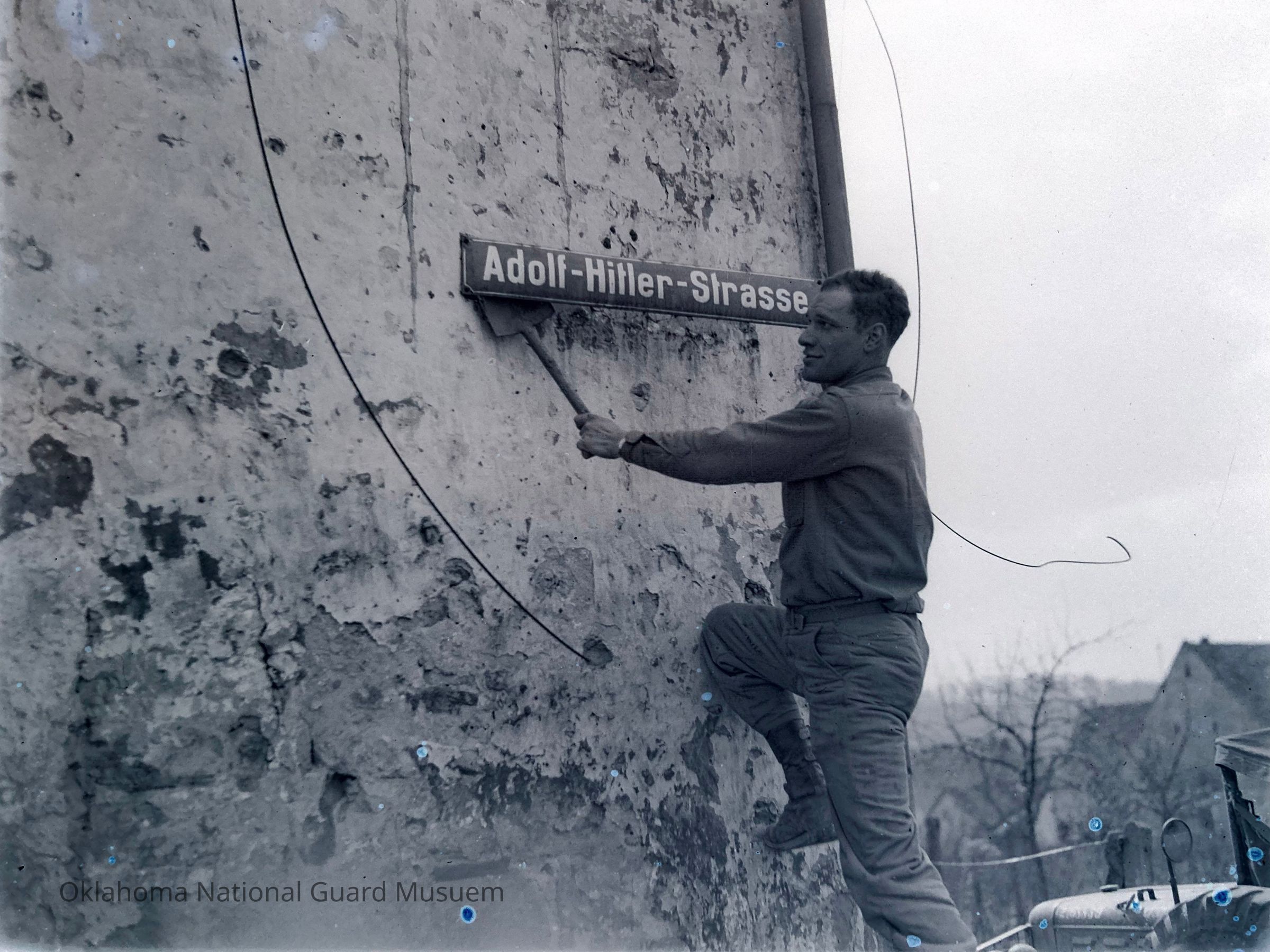 Negative of Philip J. Gardner of the 179th Infantry removing a street sign named for Adolf Hitler