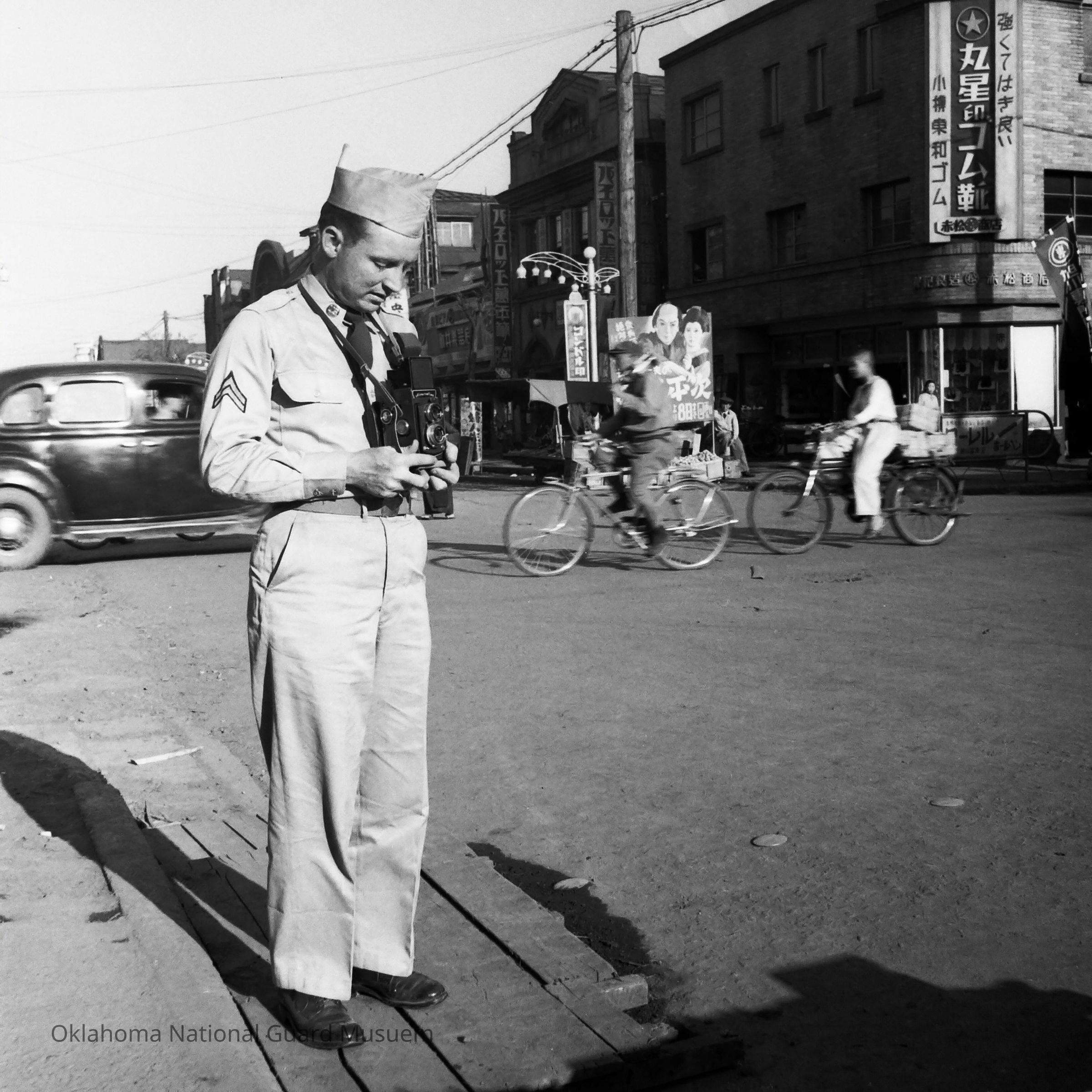Negative of a soldier taking a picture on a Sapporo street corner