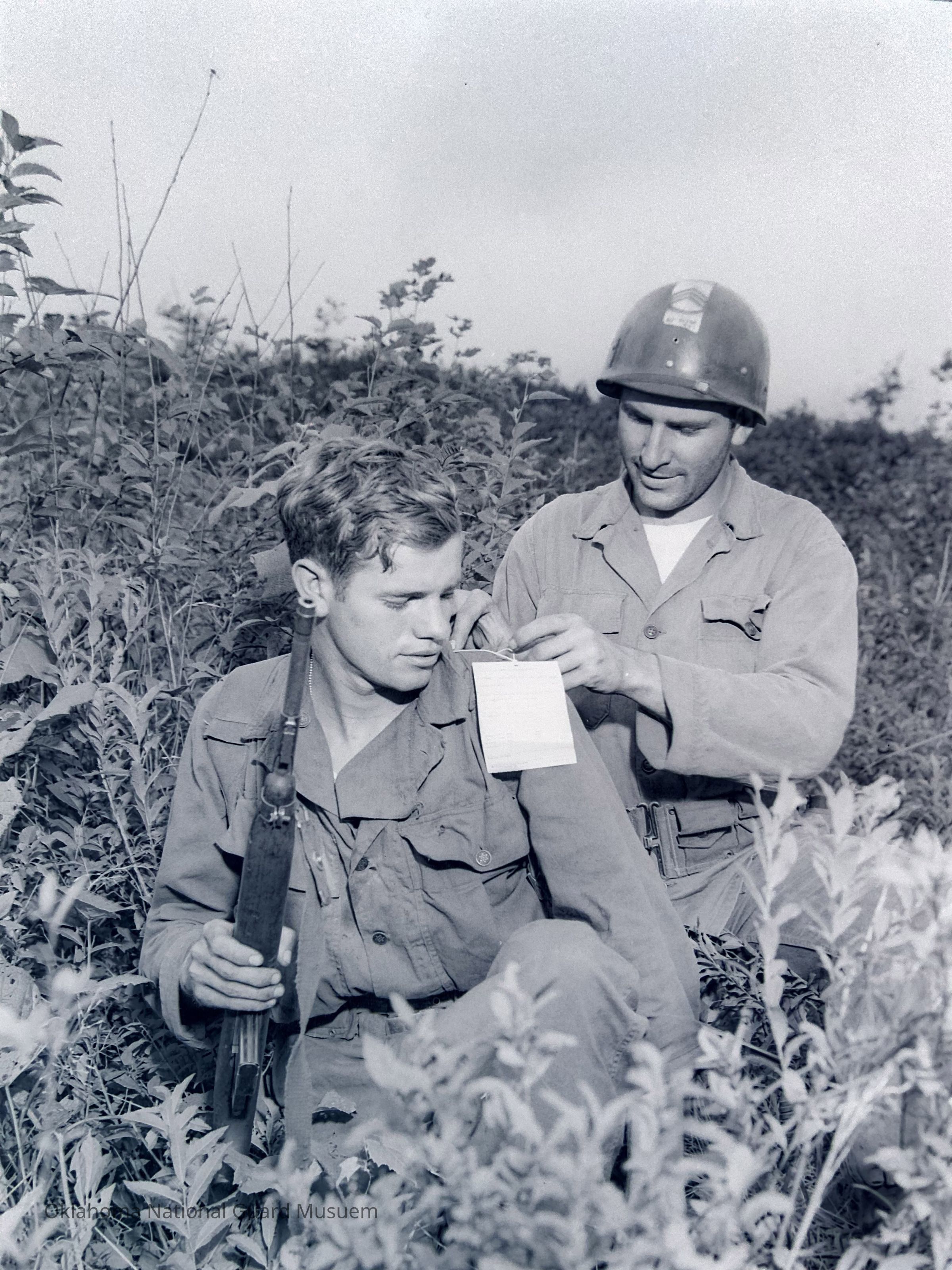 Negative of a soldier tying a tag onto a soldier's shoulder on Hokkaido, Japan.