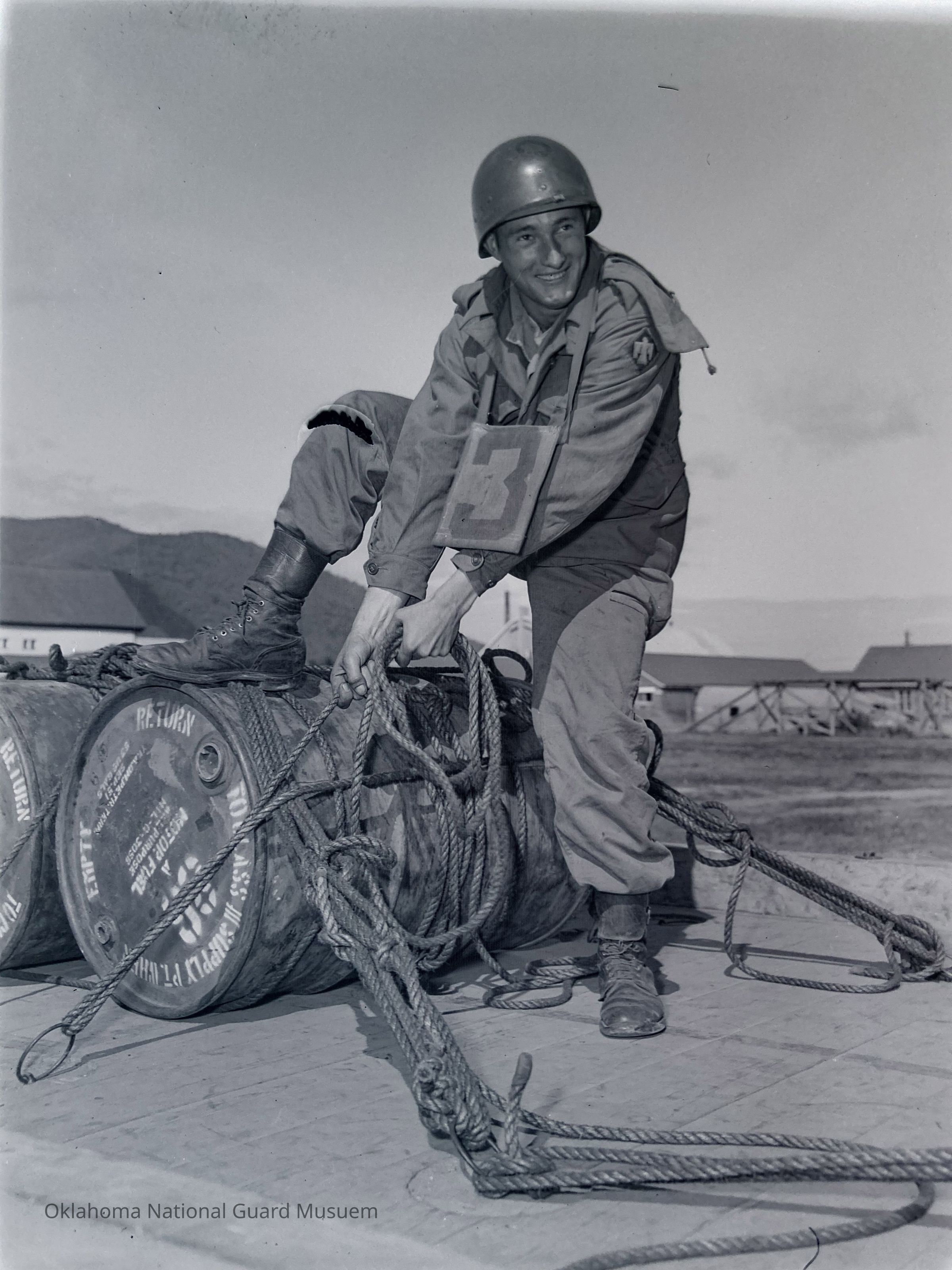 Negative of a soldier tying down a barrel of motor fuel on Hokkaido, Japan