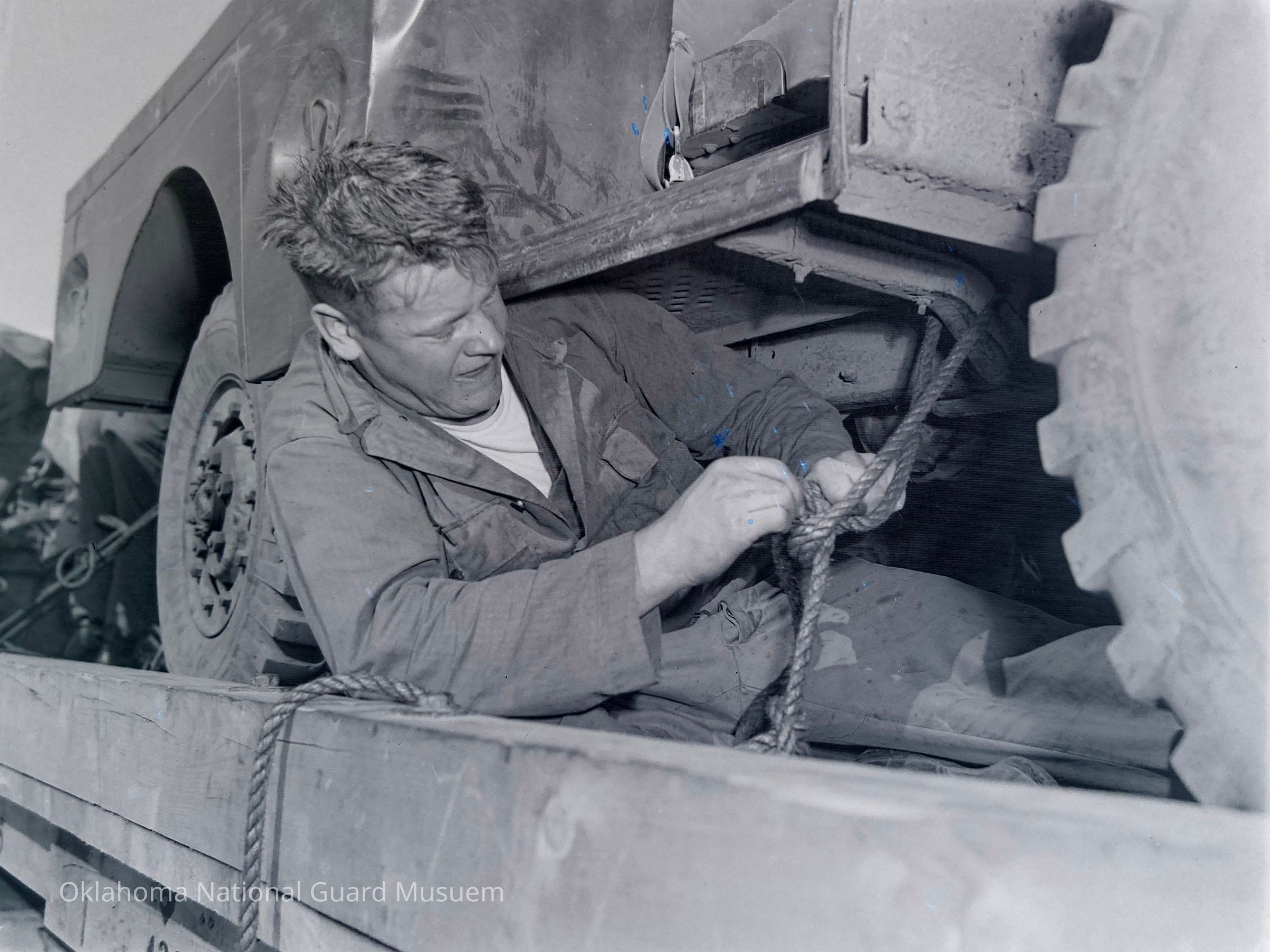 Negative of a soldier tying down a truck on a cargo pallet on Hokkaido, Japan