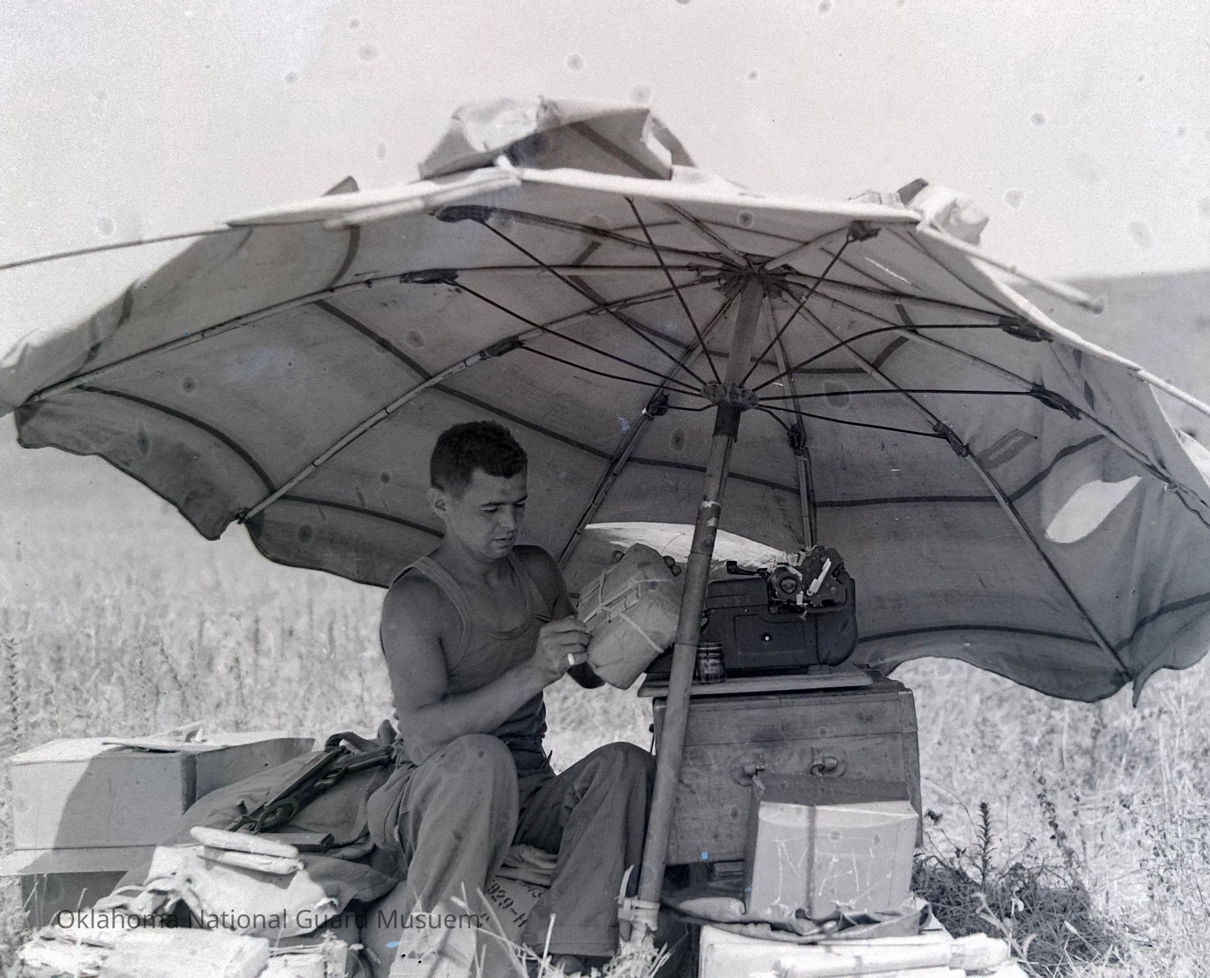 Negative of a mail clerk under an umbrella. 180th Infantry