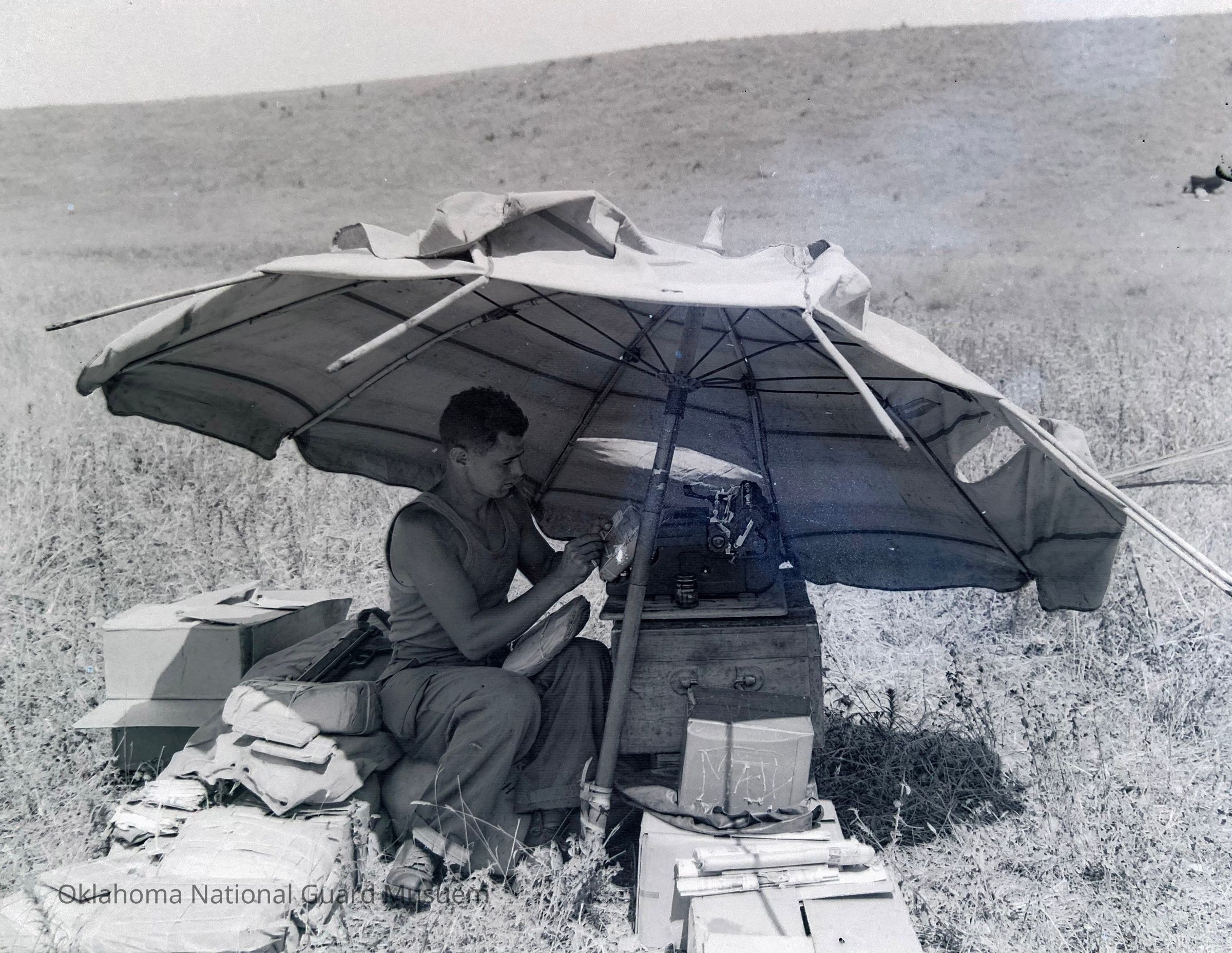 Photograph published in the 45th Division News, 22 June 1944, Vol. IV, No. 42, Caption, "Some Italian Count or Baron is probably mourning the loss of his beach umbrella, show perched in the middle of the prairie. The mailman, Cpl. Raffaele Mancaruso, Brooklyn, New York, picked it up on the push from the beachhead, and now uses it as his work room for sorting the company mail."Made/Created