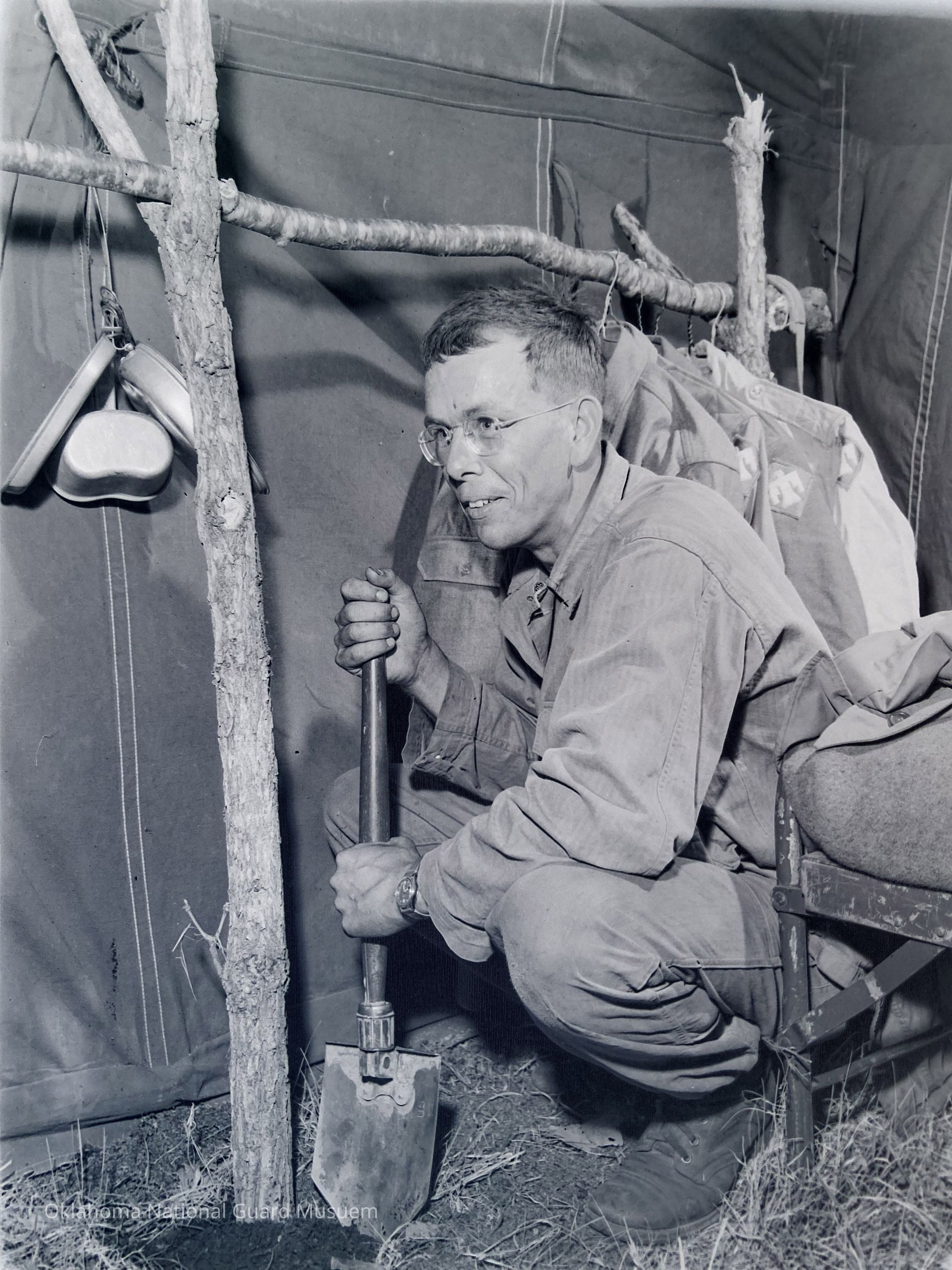 Negative of a soldier using entrenching tool to build a rough rack inside a tent on Hokkaido, Japan