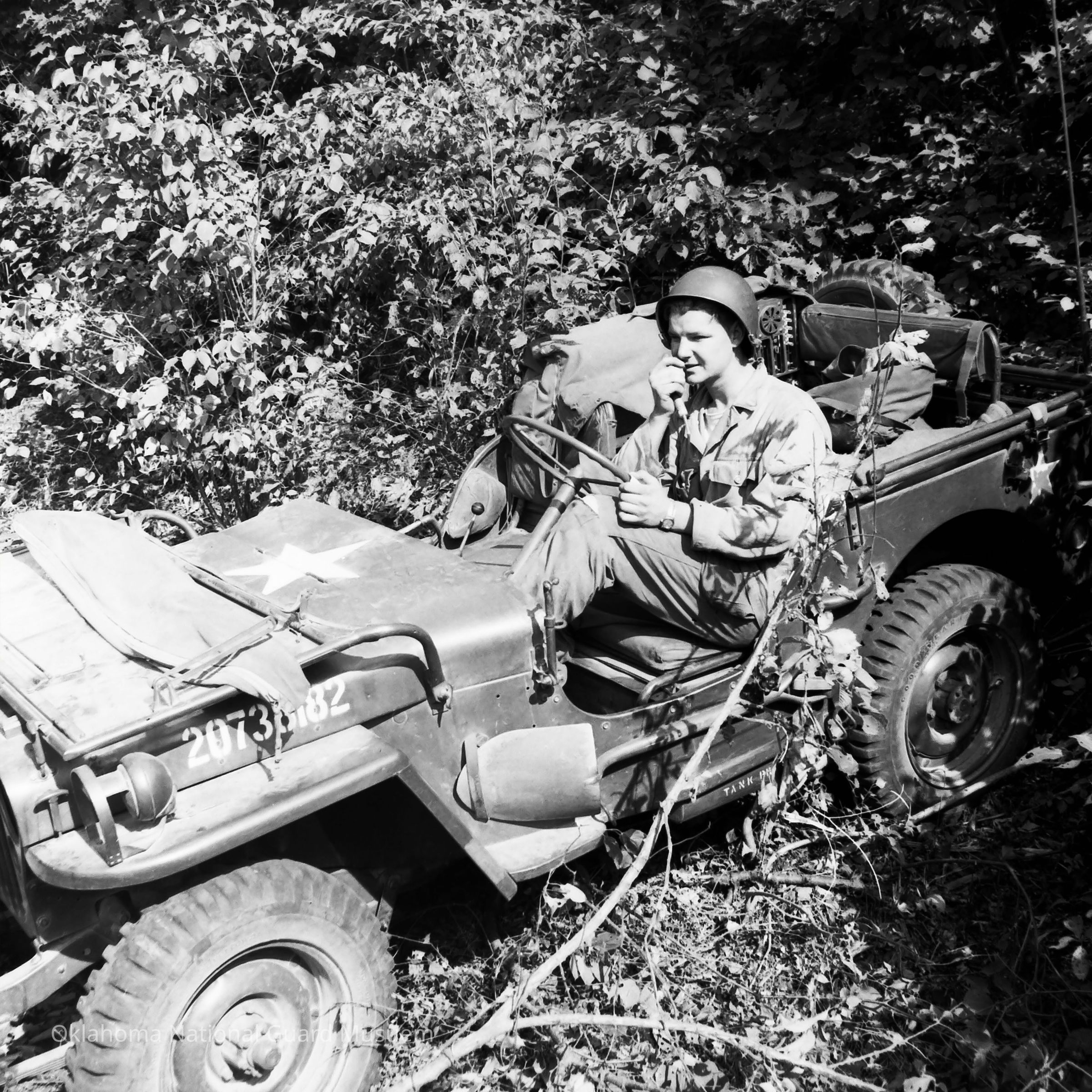 Negative of a soldier using the radio in a jeep while moving through a wooded area