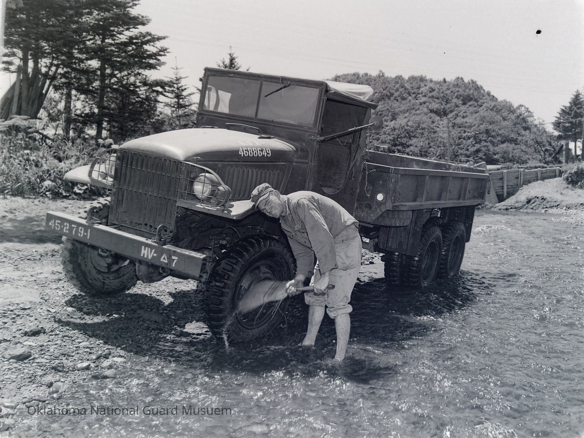 Negative of a soldier washing is 2 1/2-ton truck in a stream on Hokkaido, Japan