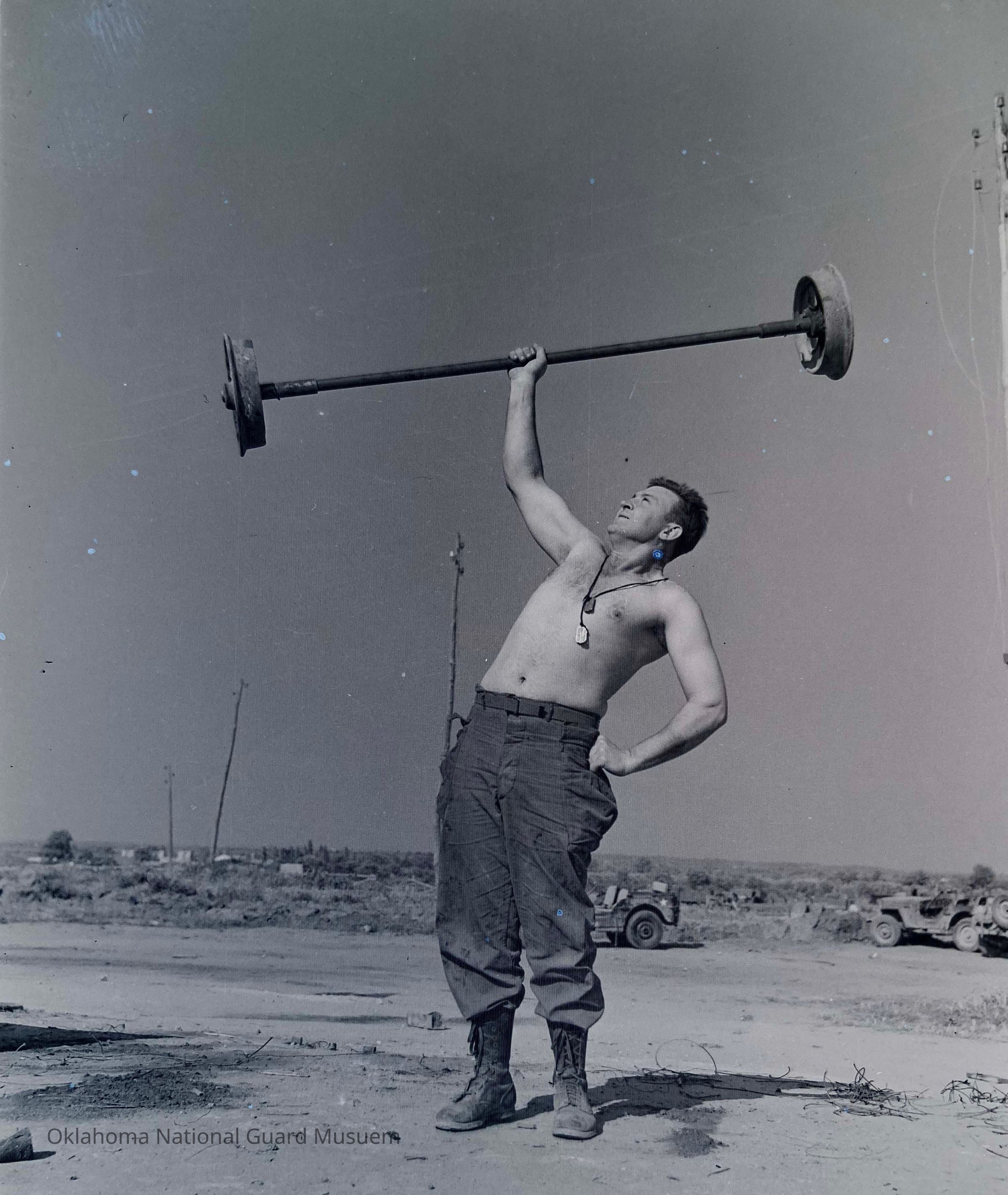 45th Division News Vol. IV No. 41 "Strongman in the Ordnance Company is DeVere Henderson (Hillrose, Colorado) showing toying with his 125-pound dumbbell. Henderson is working up to a jeep."