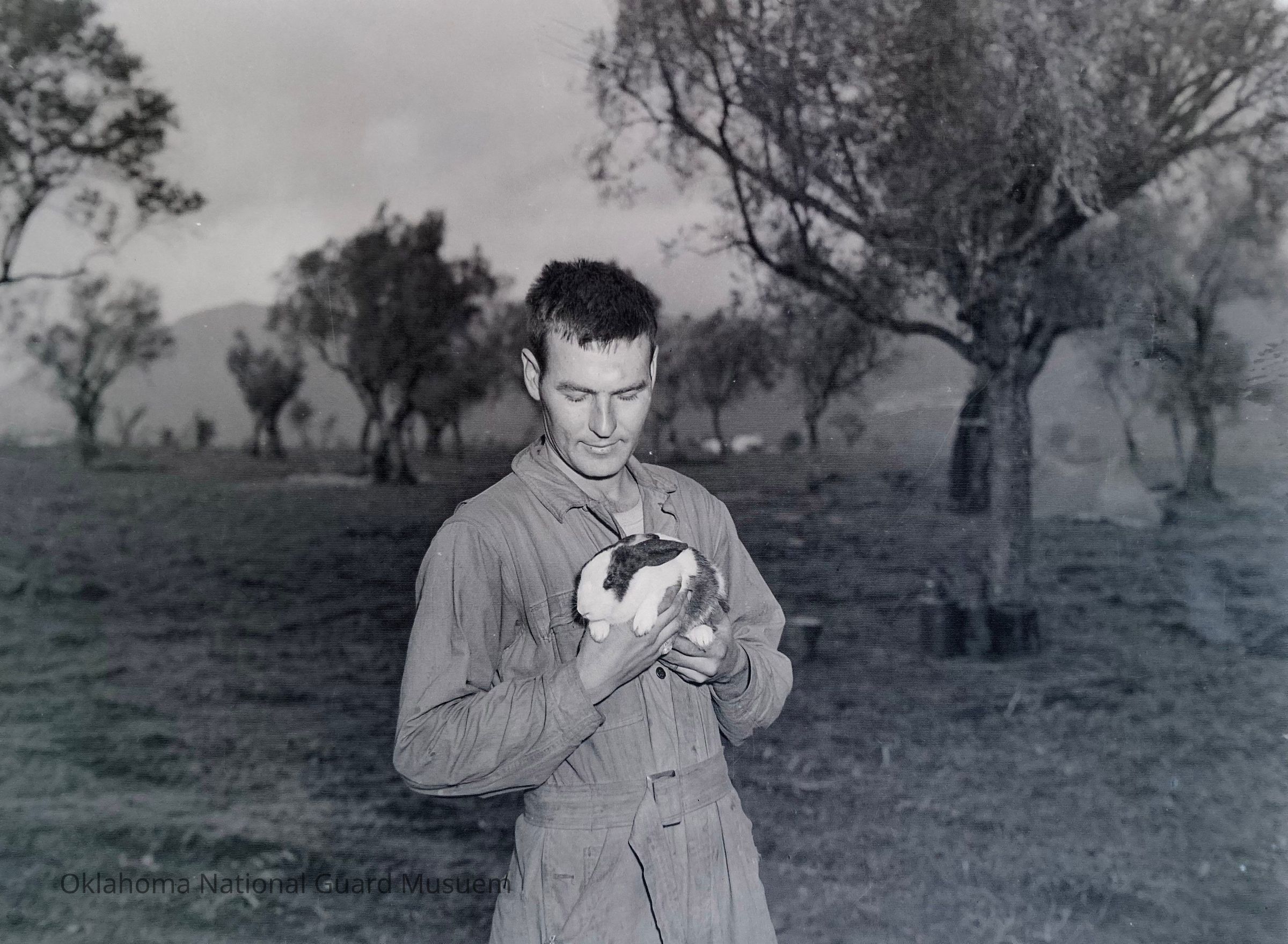 Photograph published in the 45th Division News, 4 December 1943, Vol. IV, No. 21, Caption "Sgt. C.I. Rogers, Nashville, TN, displays another of the QM pets, Gooch, a Sicilian rabbit."Made/Created