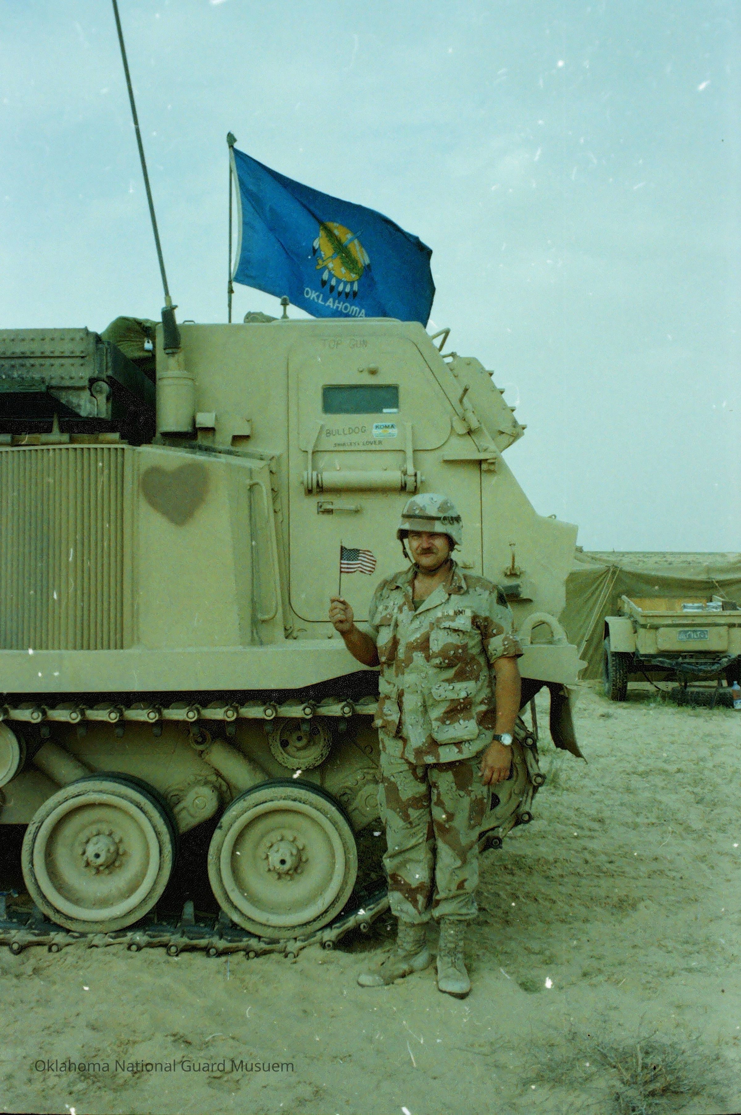 Soldier with American flag standing in front of MLRS with Oklahoma flag