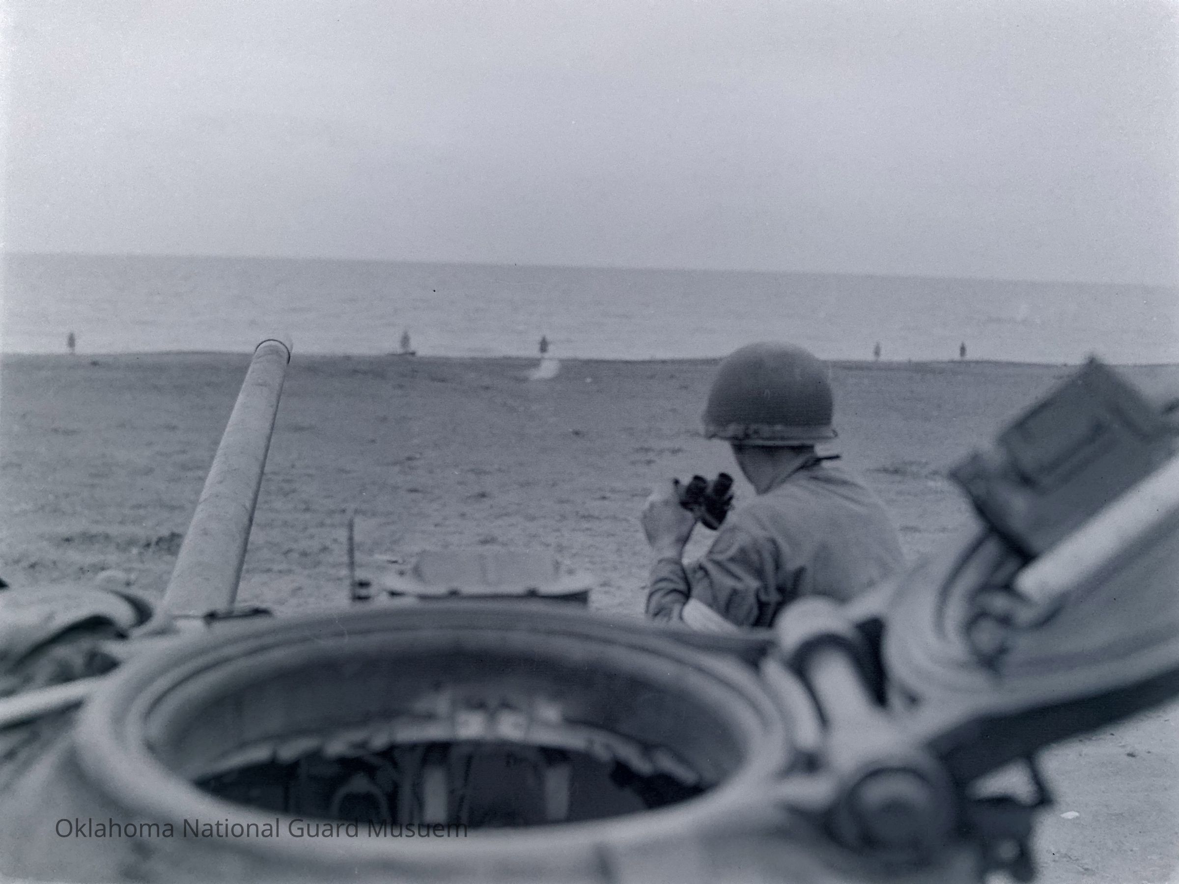 Soldier with binoculars sitting on a tank overlooking a beach area