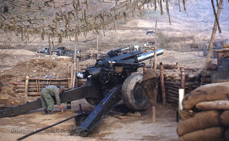 Soldier with camouflaged artillery gun. 189th Field Artillery