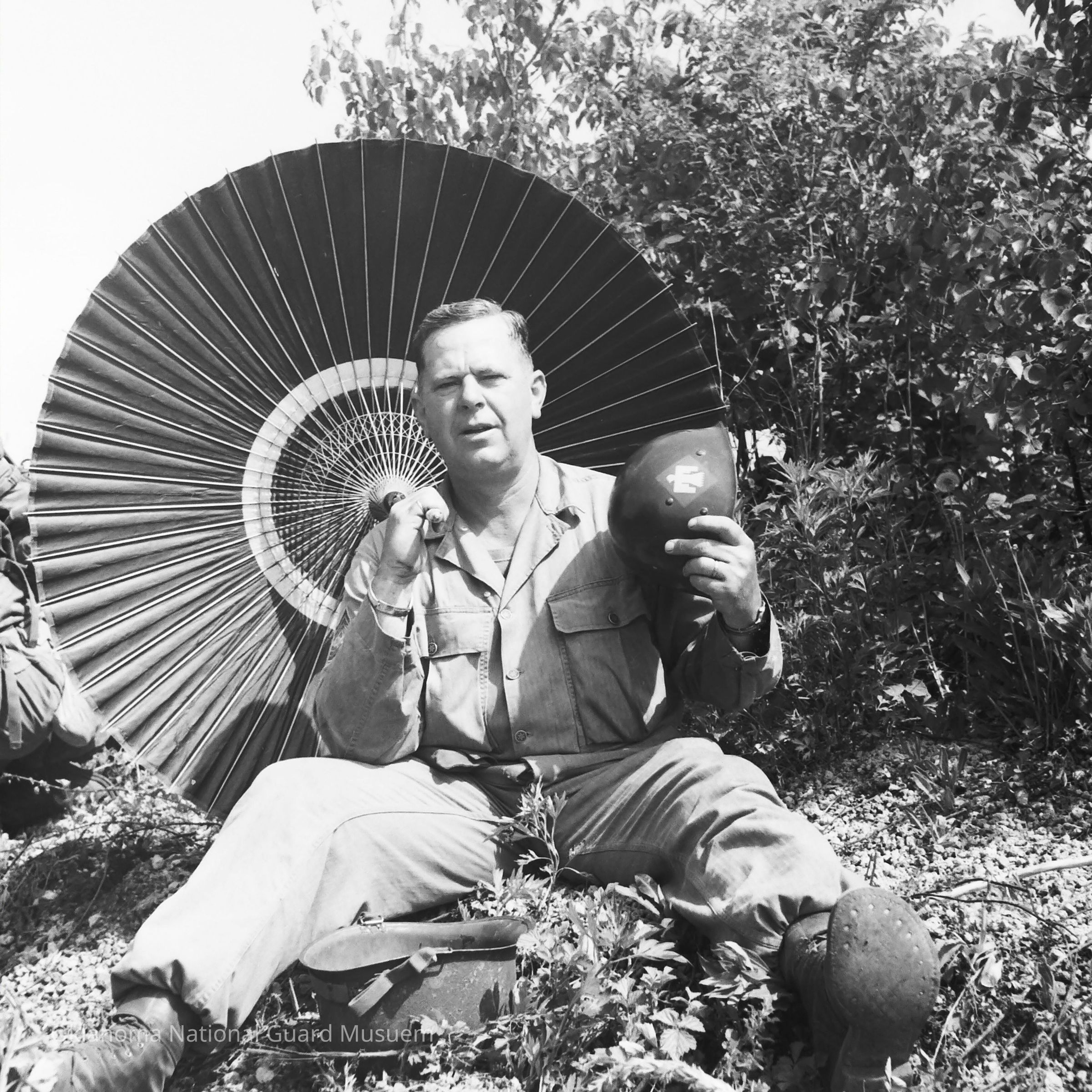Soldier with parasol and fanning himself with his helmet