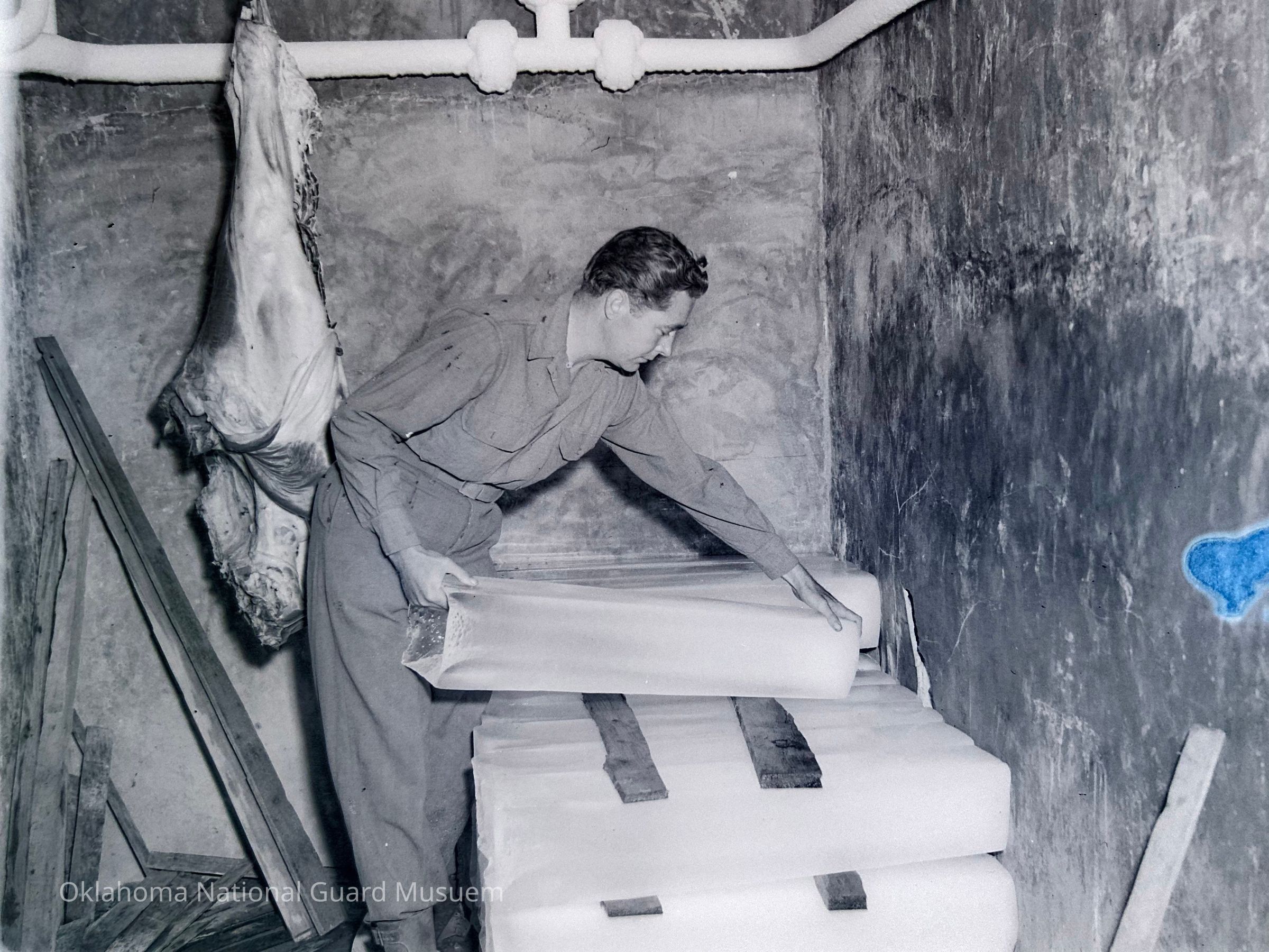 Negative of a soldier working in meat locker