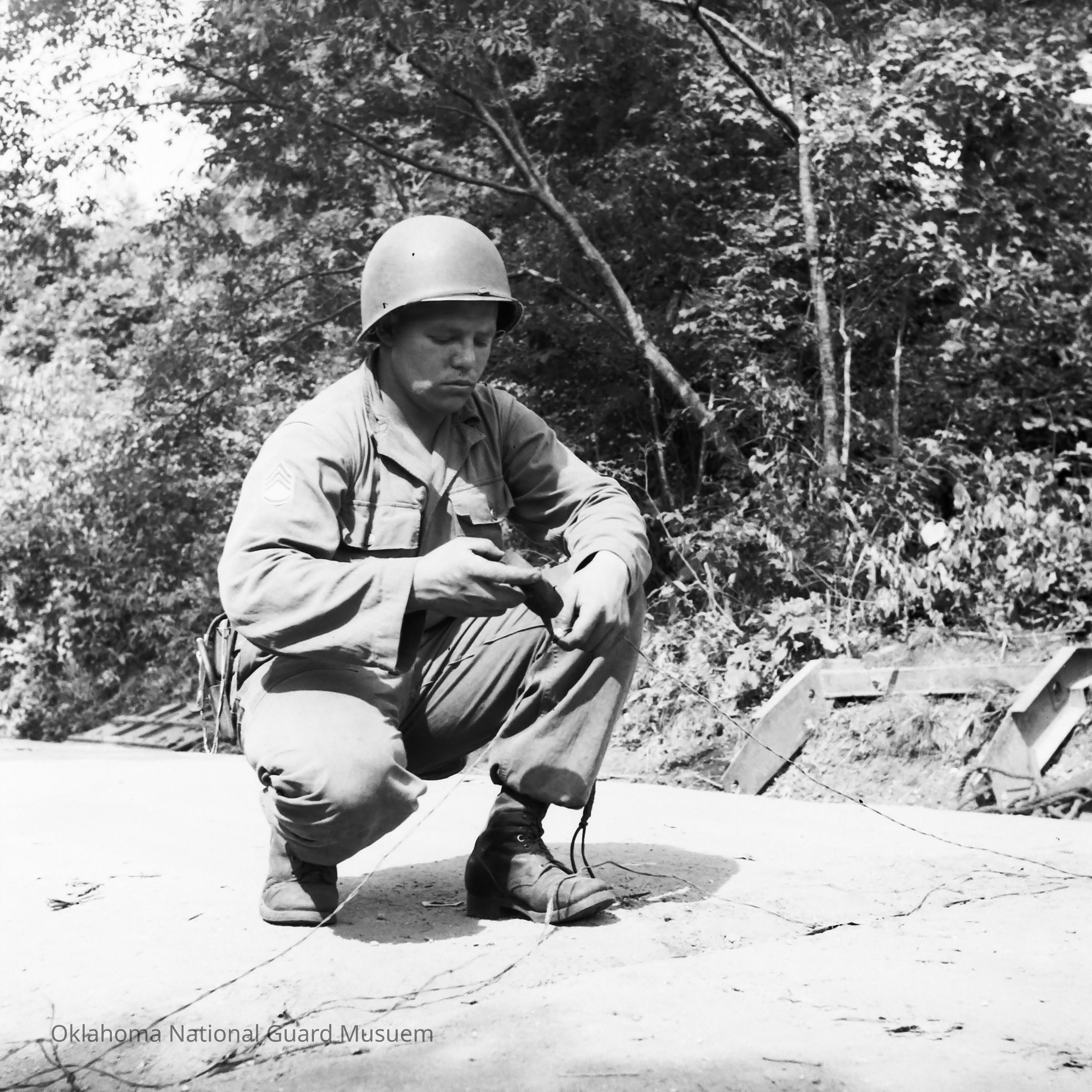 Negative of a soldier working with communication wire