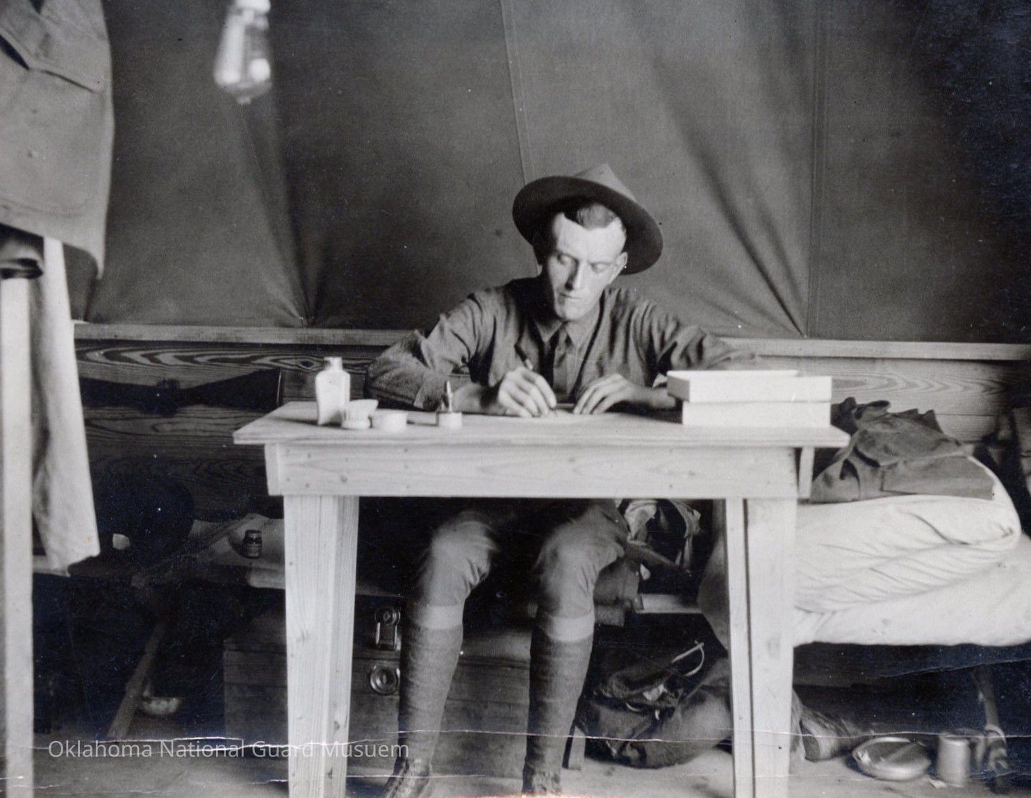 Company Clerk of Company F 111th Engineers 36th Division writing at a desk in a tent