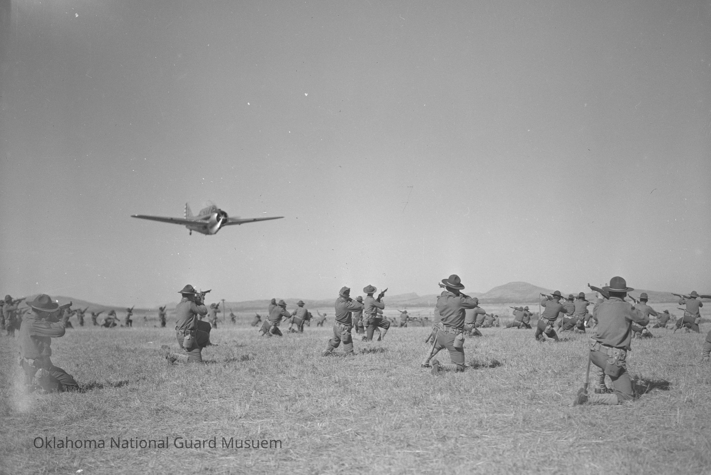 Soldiers aiming their rifles at a low-flying O-47 aircraft