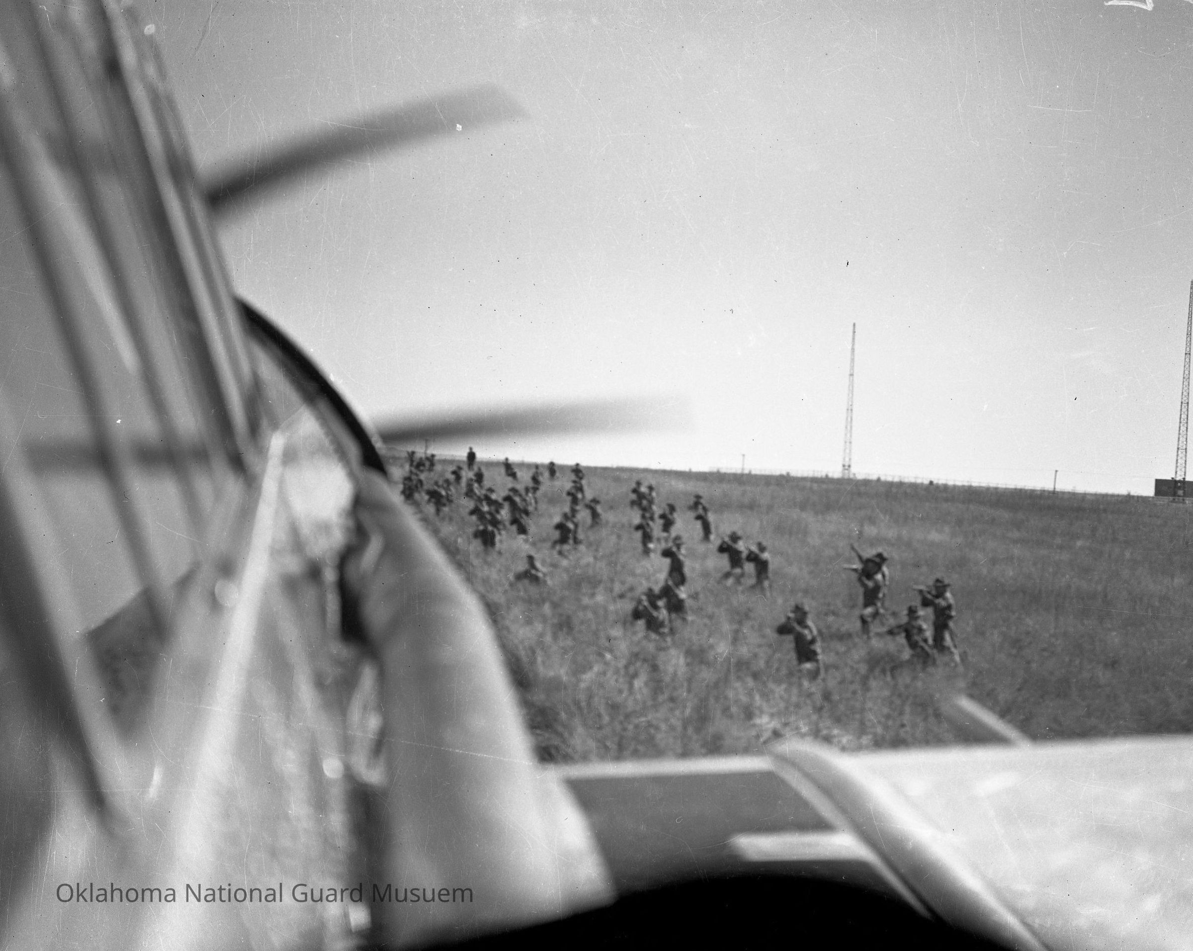 Negative of soldiers aiming their rifles at airplane
