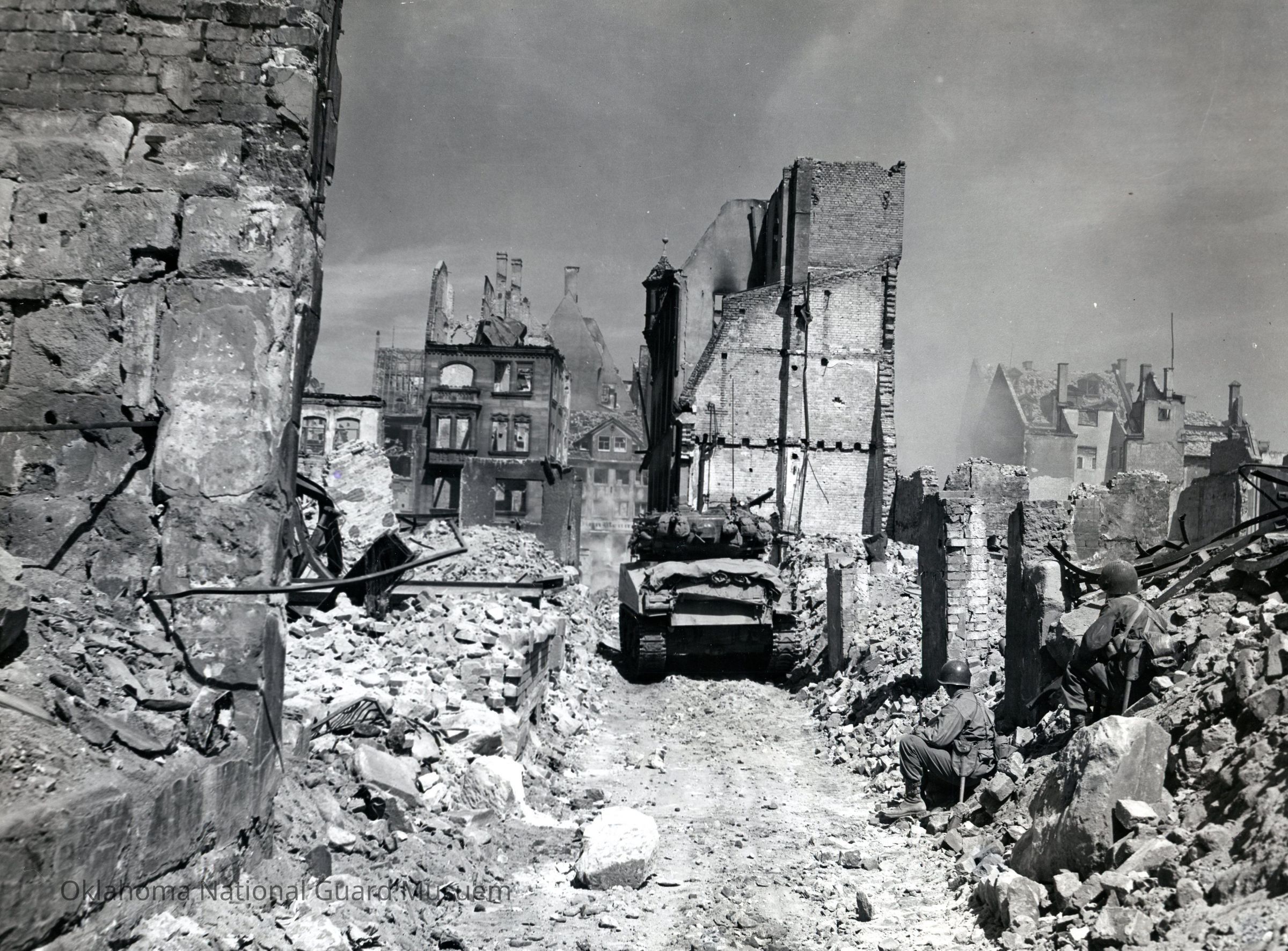 Soldiers of the 180th Infantry, with the help of a tank, search the rubble for snipers