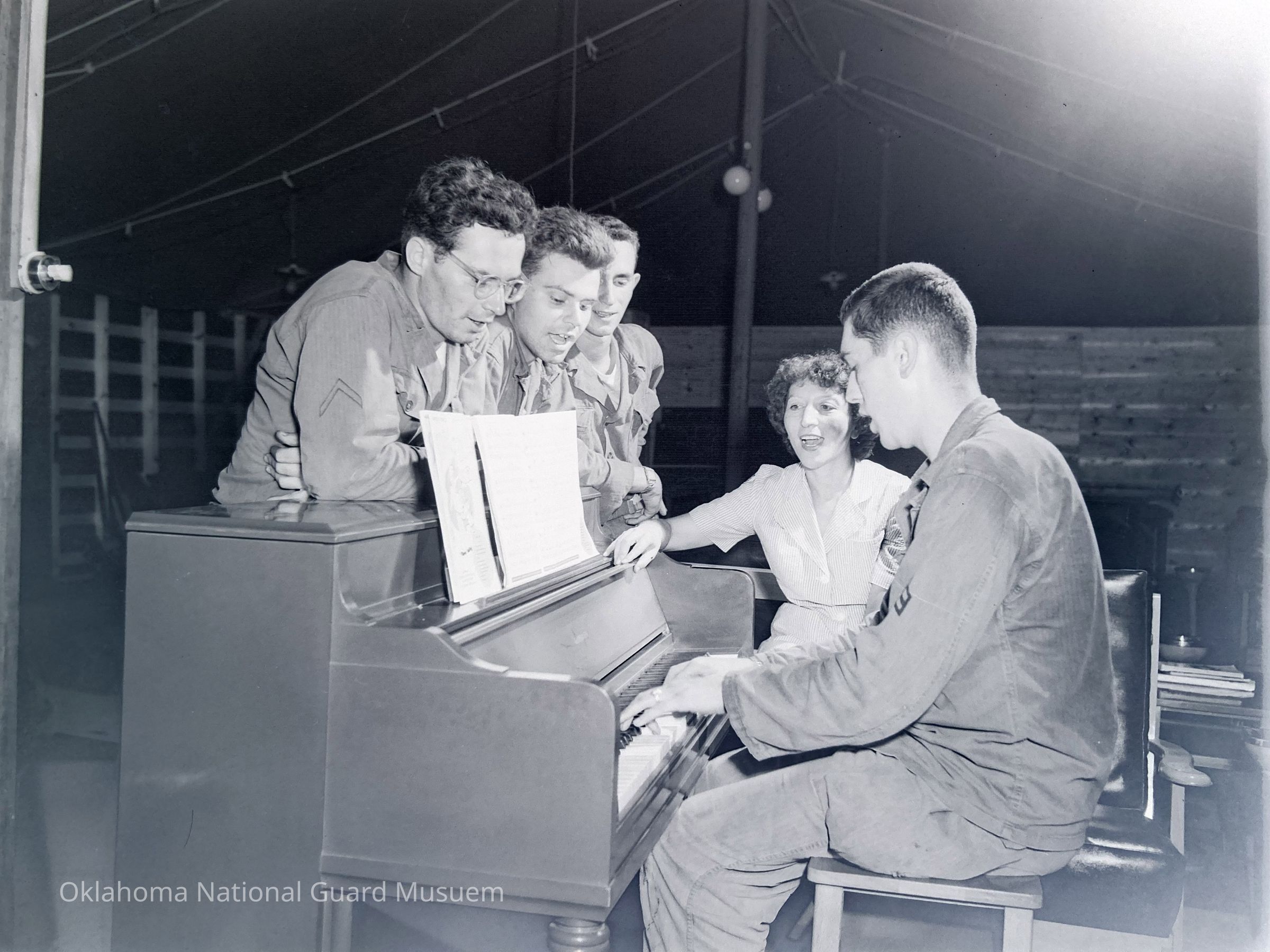 Soldiers and a woman singing around a piano