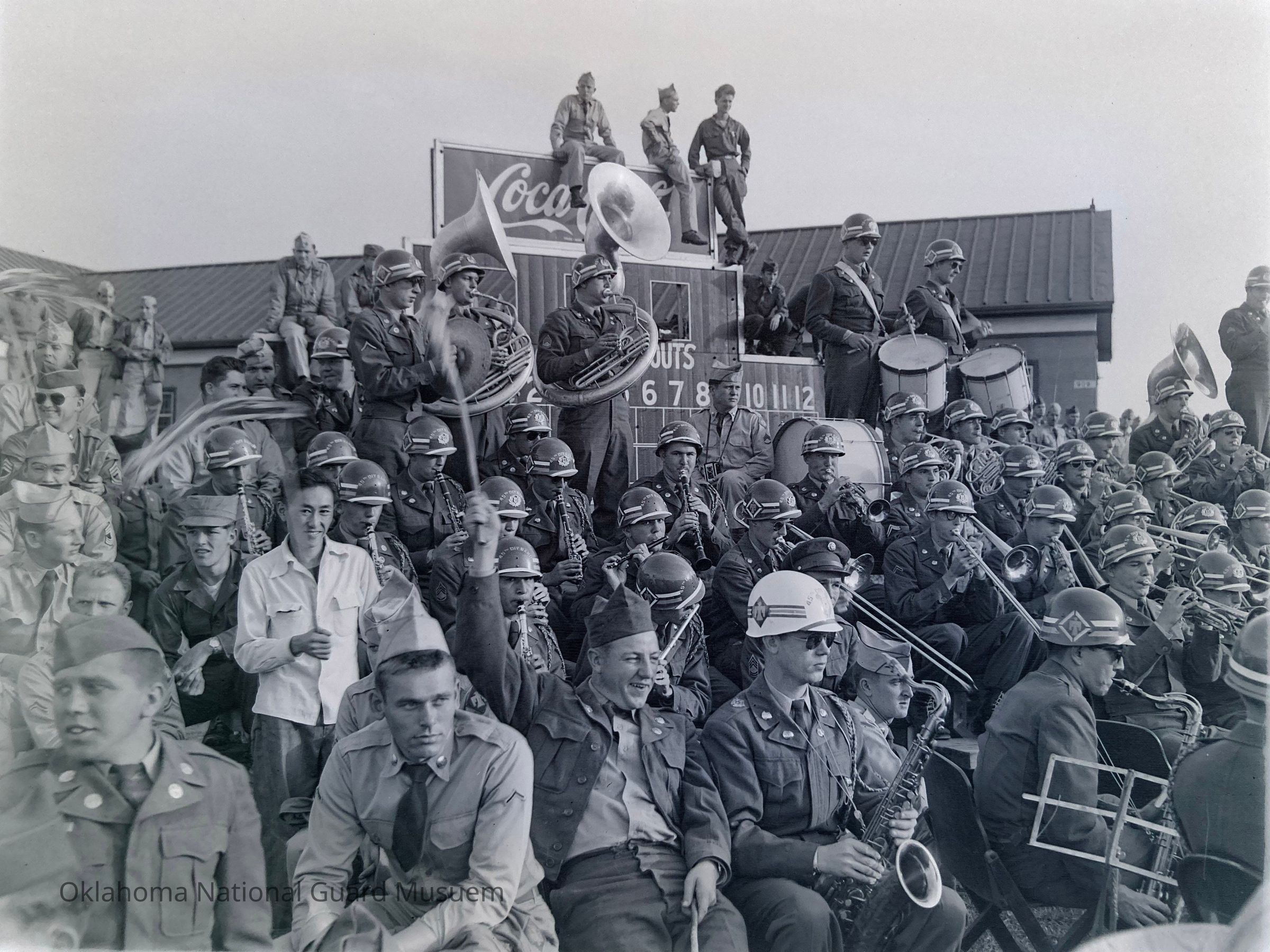 Negative of soldiers and band members gathered around scoreboard on Hokkaido, Japan