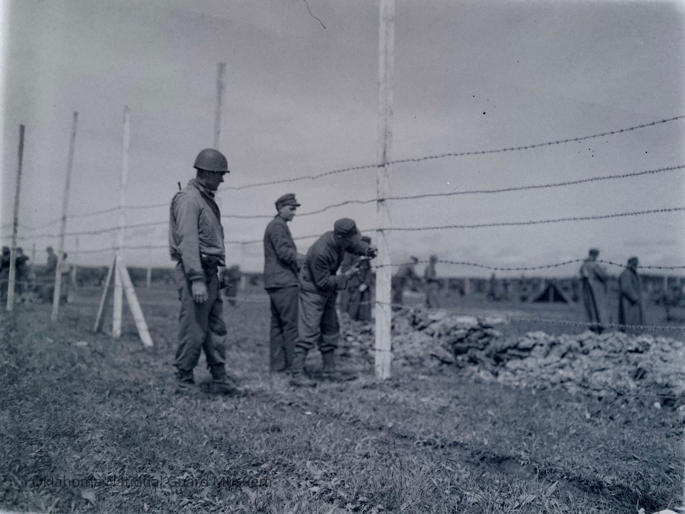 Soldiers and German prisoners working on a fence