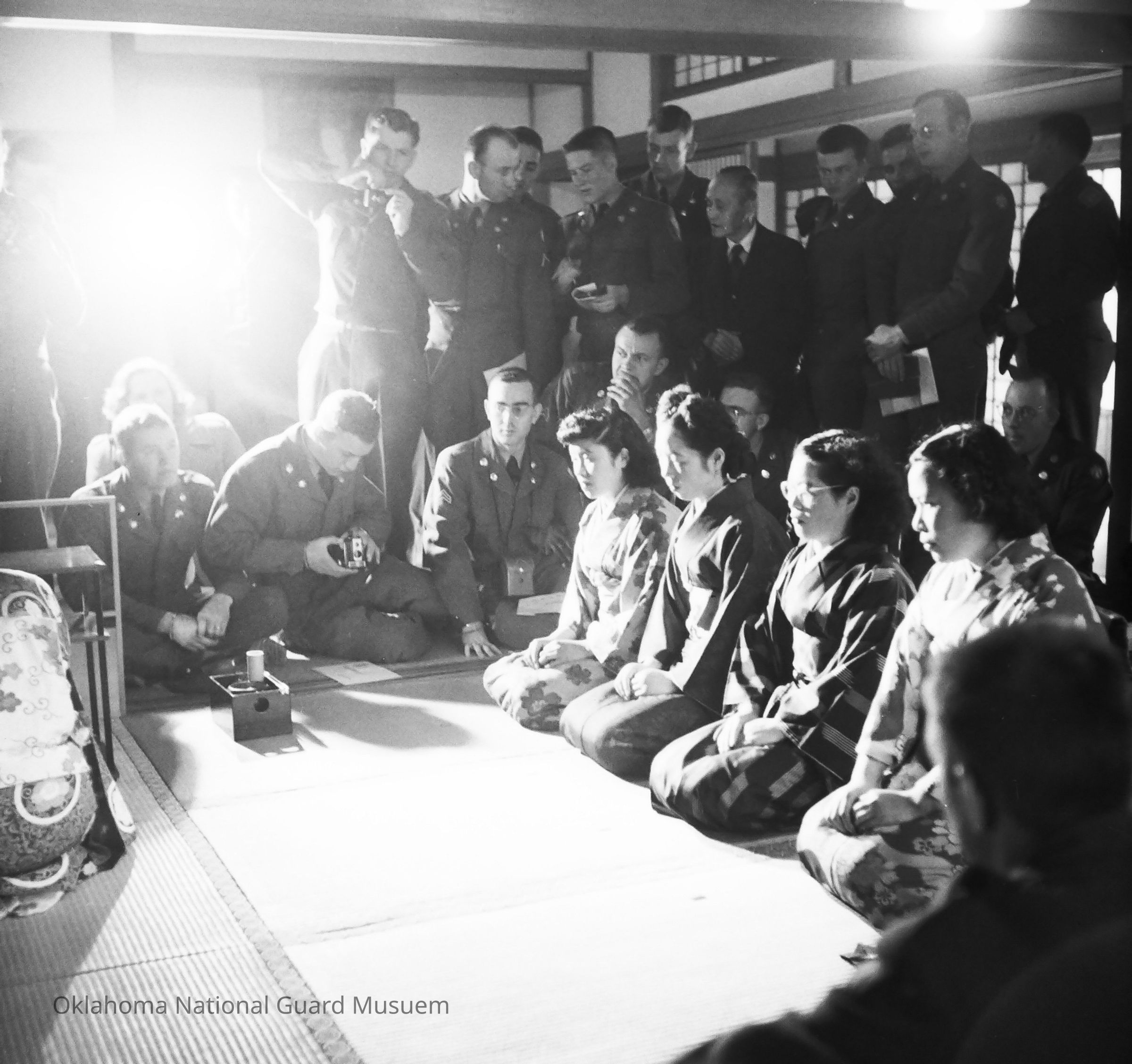 Soldiers and Japanese civilians at a tea ceremony