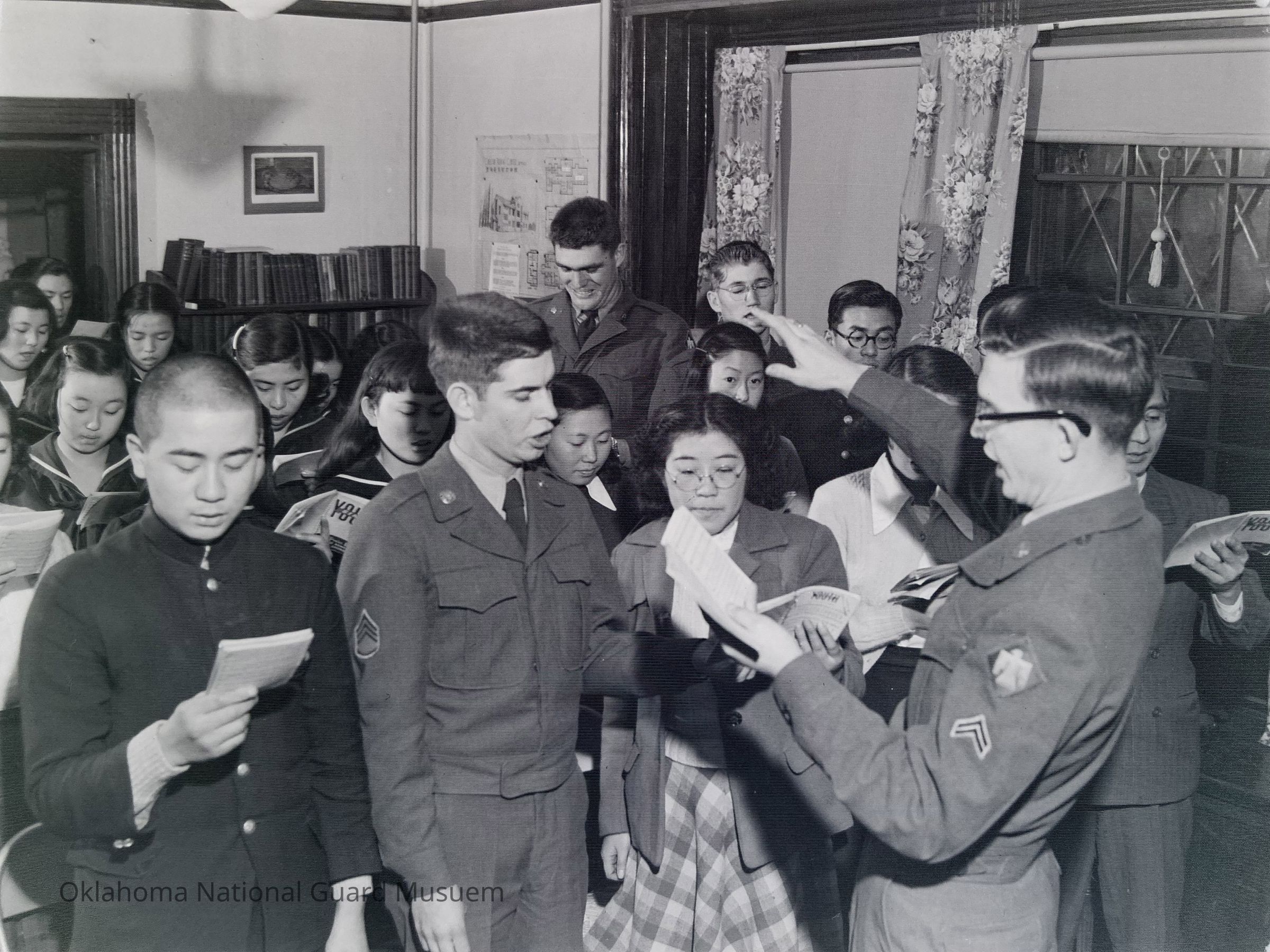 Soldiers and Japanese civilians singing together